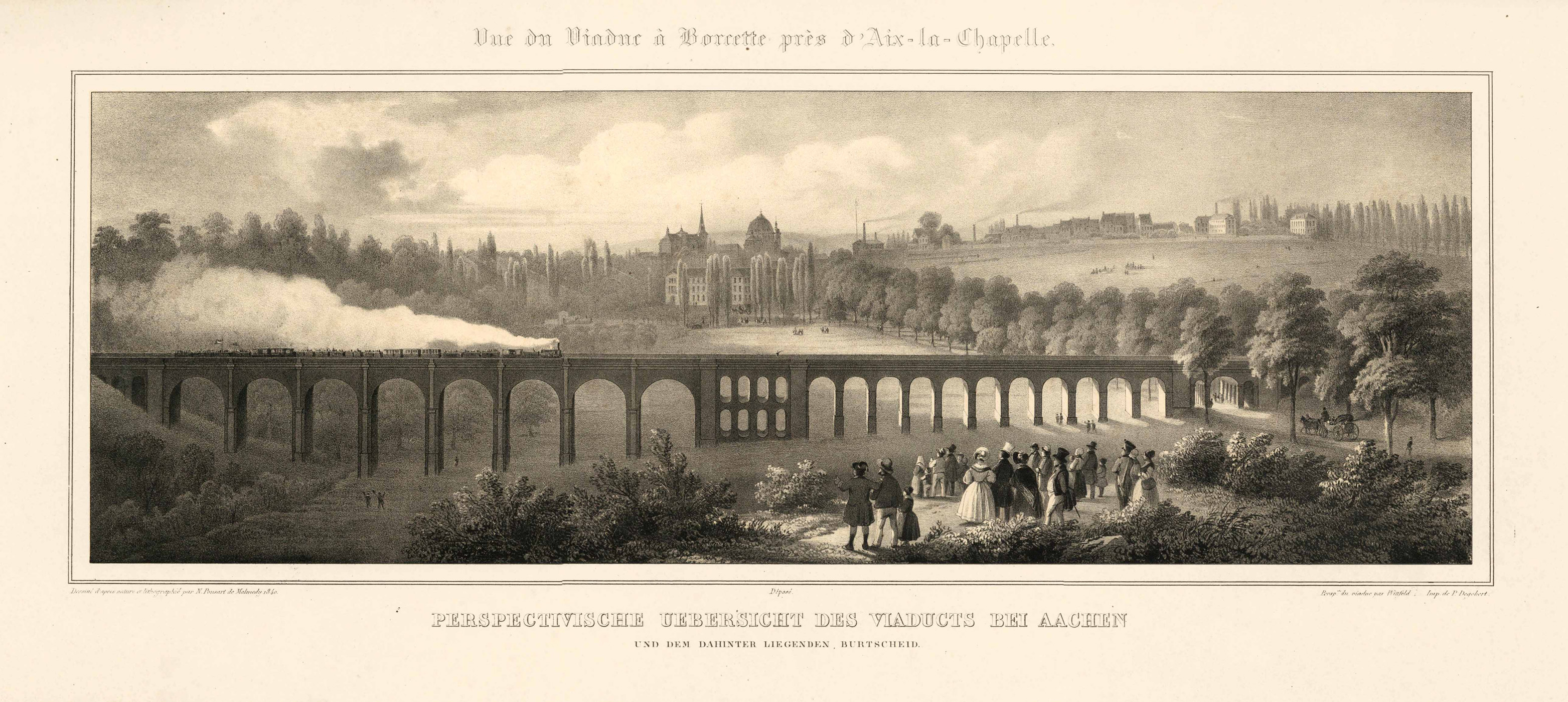 Gesamtansicht mit dem Eisenbahnviadukt und Eisenbahn über das Wurmtal im Vordergrund (‘Vue du Viaduc à Borcette près d’Aix-la-Chapelle. – Perspectivische Uebersicht des Viaducts bei Aachen und dem dahinter liegenden Burtscheid’), Lithographie v. F. Wttfeld n. Jean Nicolas Francois Ponsart in Malmedy gedr. B. P. Degobert, dat. 1840, 26 x 59 cm