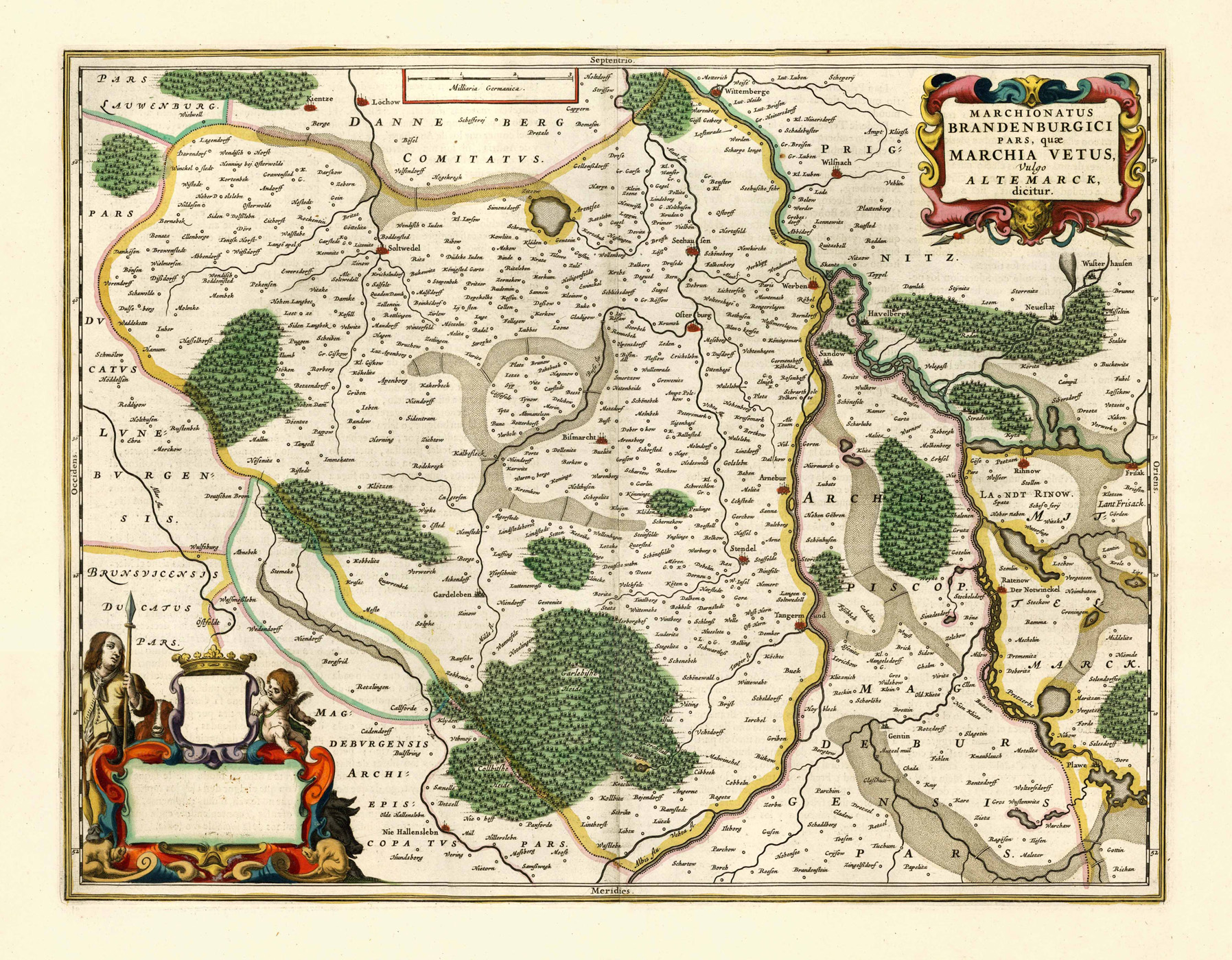 van der Krogt, Koeman’s Atlantes Neerlandici, Vol. II, 2171:2, 2:641-2. – Zeigt die Altmark mit dem Gebiet Friesack, Haldensleben, Wittenberge und Wolfsburg. – Mittig Bismark, Gardelegen und Stendal. – Oben rechts Titelkartusche. – Unten links figürliche Kartusche mit leeren Wappenschild. – Im Kartenhimmel Maßstab. – Im Jahr 1659 begann Joan Blaeu mit der Veröffentlichung des spanischen “Nuevo Atlas”. Als das Feuer 1672 die Druckerei Blaeus zerstörte, war der letzte Band im Druck, und diese Neuauflage wurde nie fertiggestellt (10 Bände wurden fertig). – Die Kupferplatten für die Bände 3 und 4 (Germania und die Niederlande) sind nicht im Feuer verloren gegangen. – Die vorliegende Karte erschien nur in fünf Blaeu Major Ausgaben mit lateinischem, französischem, niederländischem, deutschem und spanischem Buchtext. – Vorliegendes Exemplar in der seltenen und einzigen spanischen Ausgabe!