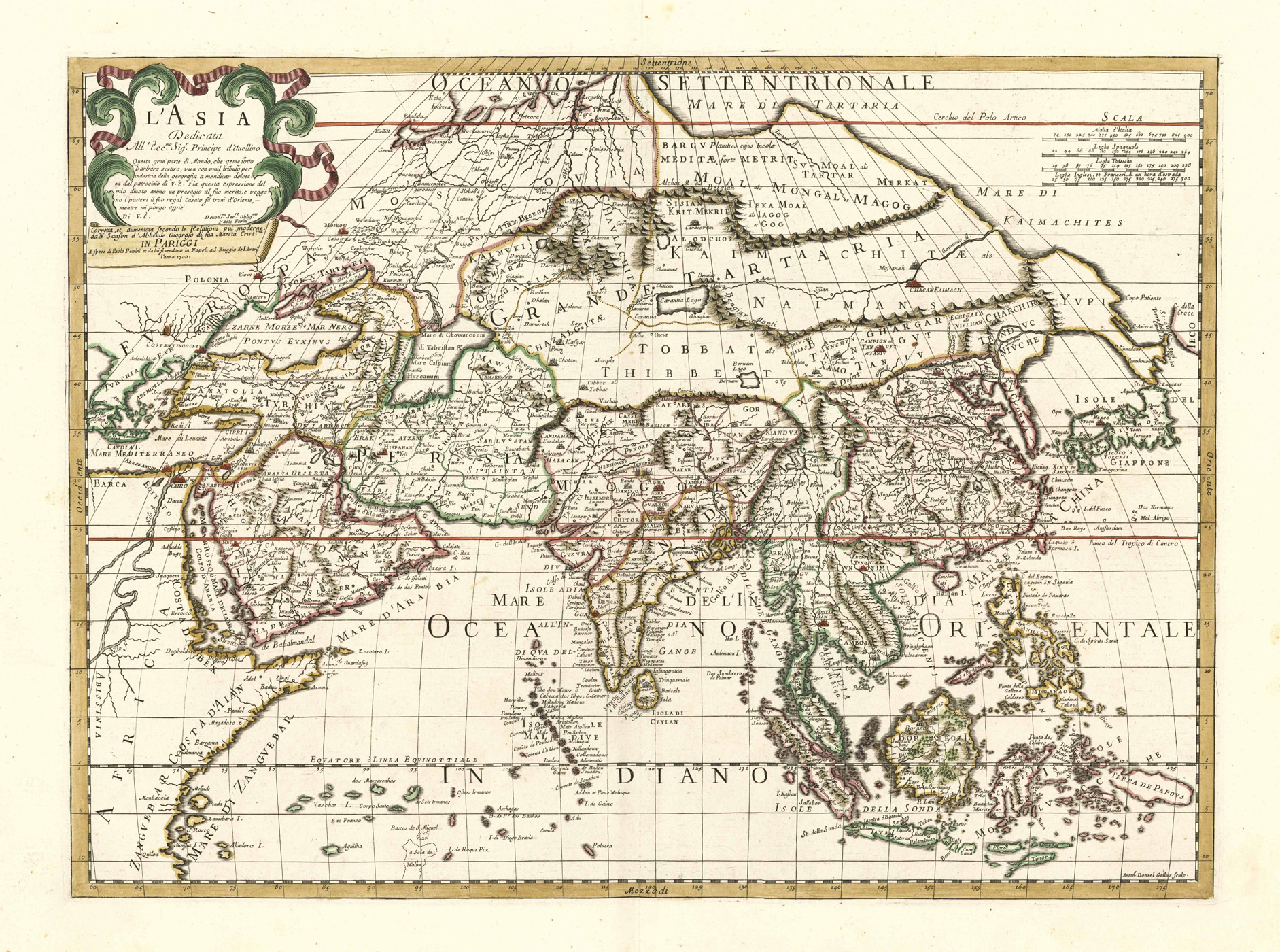 Tooley’s Dic. of Mapm. Rev. Ed. K – P, page 414. – Zeigt Asien als Kontinent. – Oben links Titelkartusche; darunter Girlande mit Autoren-, Verlegerangabe und Datierung. – Oben rechts Meilenzeiger. – Vorliegendes Exemplar der 1. Zustand (2. Zustand 1766)Paolo Petrini in Neapel (Napoli / Naples) war zwischen 1692 und 1766 aktiv. – Die Informationen über die Biographie von Petrini sind sehr spärlich. – Er arbeitete dort als Buchhändler, Kartenverkäufer, Kartograph und Kupferstecher in der S. Biaggio de Librari (Via San Biagio Dei Librai). – Zuerst als Kupferstecher von Porträts berühmter Neapolitaner, dann als kleiner Verleger und Buchhändler. – Petrini war vor allen Dingen als Kartograph tätig und stellte seine eigenen Landkarten nach geographischen Vorlagen der klassischen und genauesten Autoren her, die er nach dem modernsten Wissen korrigiert und verbessert hat. – Dadurch entstand eine Sammlung von 75 uns bekannten verschiedenen Landkarten, die Petrini im letzten Jahrzehnt des siebzehnten Jahrhunderts skizziert hatte und Anfang 1700 in Neapel zuerst als lose Blätter herausgegeben und dann später als Atlas “Atlante Partenopeo” (Atlas der Neapolitaner) verlegt worden sind. – Von dem Atlas ist kein gedruckter Index bekannt. – Die Verbreitung der Karten, zuerst als Einblattdrucke und später als Atlas, war auf den Bereich des Königreichs Neapel beschränkt. – Weil die Karten international nicht auf den Markt kamen, konnte Petrini den Erfolg leider nicht mehr genießen, den sein Kartenwerk verdient hätte. – Dadurch ergibt sich heute die absolute Seltenheit. – Tatsächlich ist die kartographische Arbeit von Petrini eindeutig auf Karten anderer sehr maßgeblicher Kartographen wie Sanson, Rossi oder den Zeitgenossen Nicolas De Fer zurückzuführen. – Die Karten Süditaliens gehen auf Giovanni Antonio Magini und Arbeiten von Cantelli da Vignola zurück. – Petrini aktualisierte die Straßen und die Ortsnamen. – Durch die Art und Weise Landkarten zu gravieren, entstand sein unnachahmlicher außergewöhnlicher Stil. – Sehr selten!