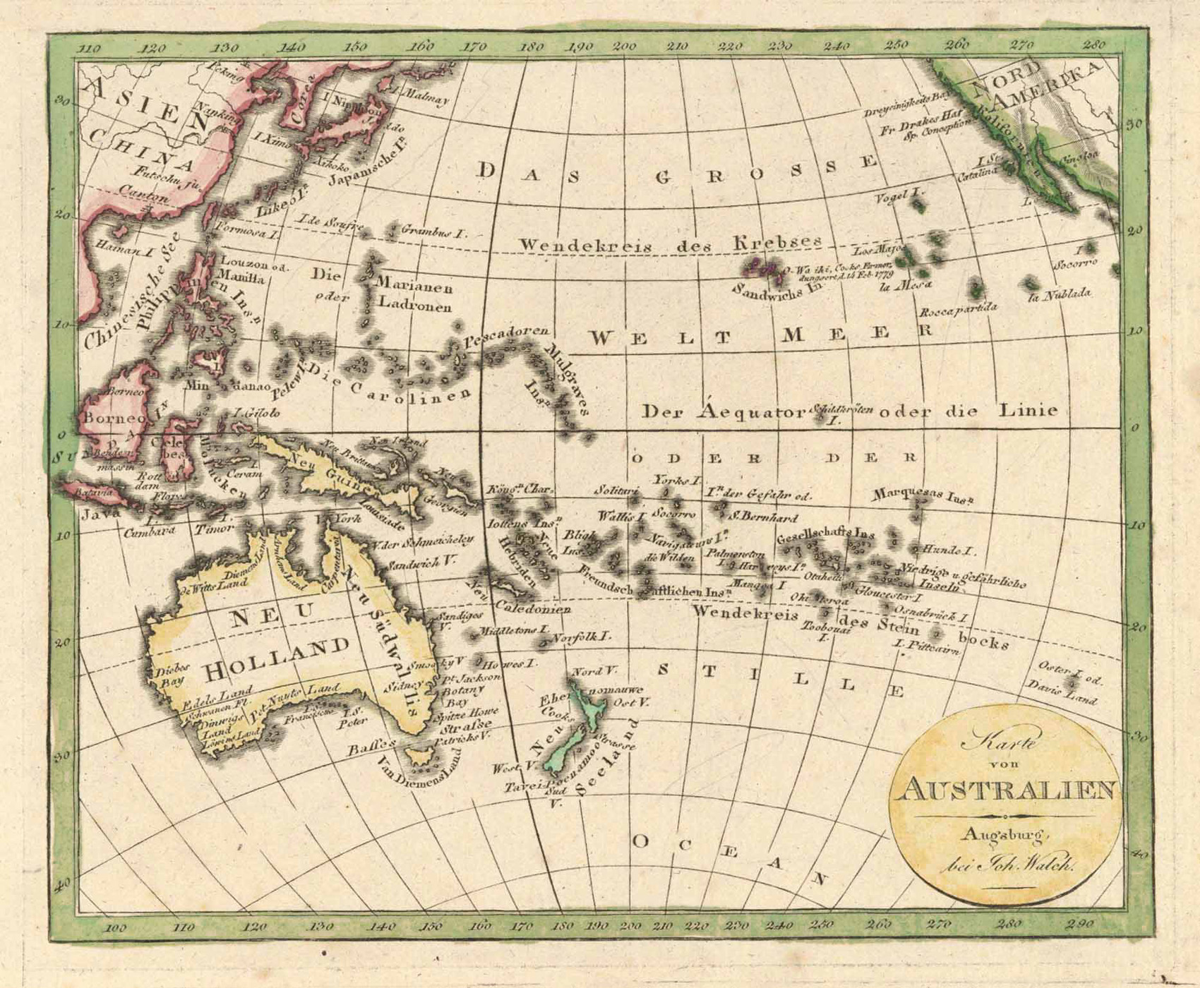 Tooley’s Dic. of Mapm. Rev. Ed. Q – Z, S. 343 (Johann <Jean; Johannes> Walch, 1757-1824. Cartographer and map publisher of Augsburg, son-in-law of Johann Martin Will whom he succeeded in 1806. …); Gier-Janota, Augsburger Buchdruck u. Verlagswesen, S. 1303 (Johann Walch). – Zeigt Australien, Neuseeland, den westlichen Teil von Indonesien, die Philippinen, die nordöstliche Küste von China mit Korea und Japan, die nordwestliche Küste von Nordamerika mit Kalifornien, Neuguinea, Polynesien und den Pazifischen Ozean. – Unten rechts Kartentitel und Verlegeradresse.