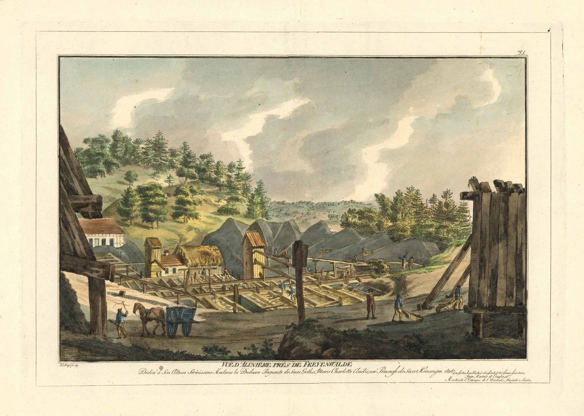Alaunwerk im Alauntal bei Freienwalde (‘Vue D’Aluniére Prés De Freyenwalde – J.F. Nagel fec. 1789. – Jean Morino et Compagl: Marchands d’Estampes de l’Academie Royale à Berlin.’), altkolorierte u. eiweißerhöhte Umrissradierung v. J.F. Nagel b. Jean Morino in Berlin, dat. 1789, 25 x 38 cm