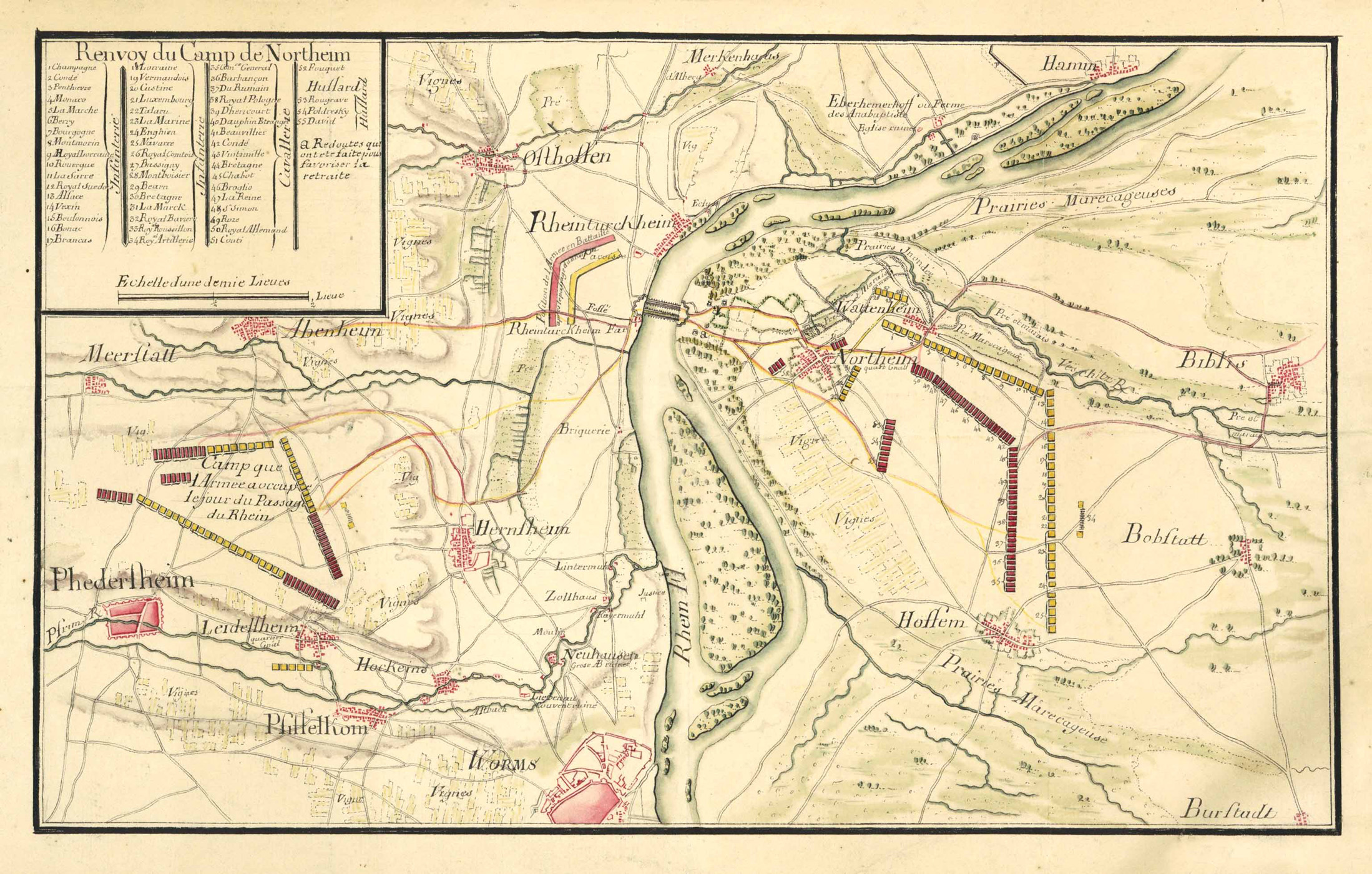 Karte mit Einzeichnungen von Truppenstellungen im Jahre 1743 zwischen Biblis und Worms-Pfeddersheim. – Die Städte Abenheim, Pfiffligheim, Herrnsheim, Rheindürkheim, Osthofen, Leiselheim, Mörstadt, Nordheim, Biblis, Wattenheim, Hamm am Rhein mit kleinen detaillierten Plänen. – Sehr feiner und perfekt erhaltener Manuskriptplan!