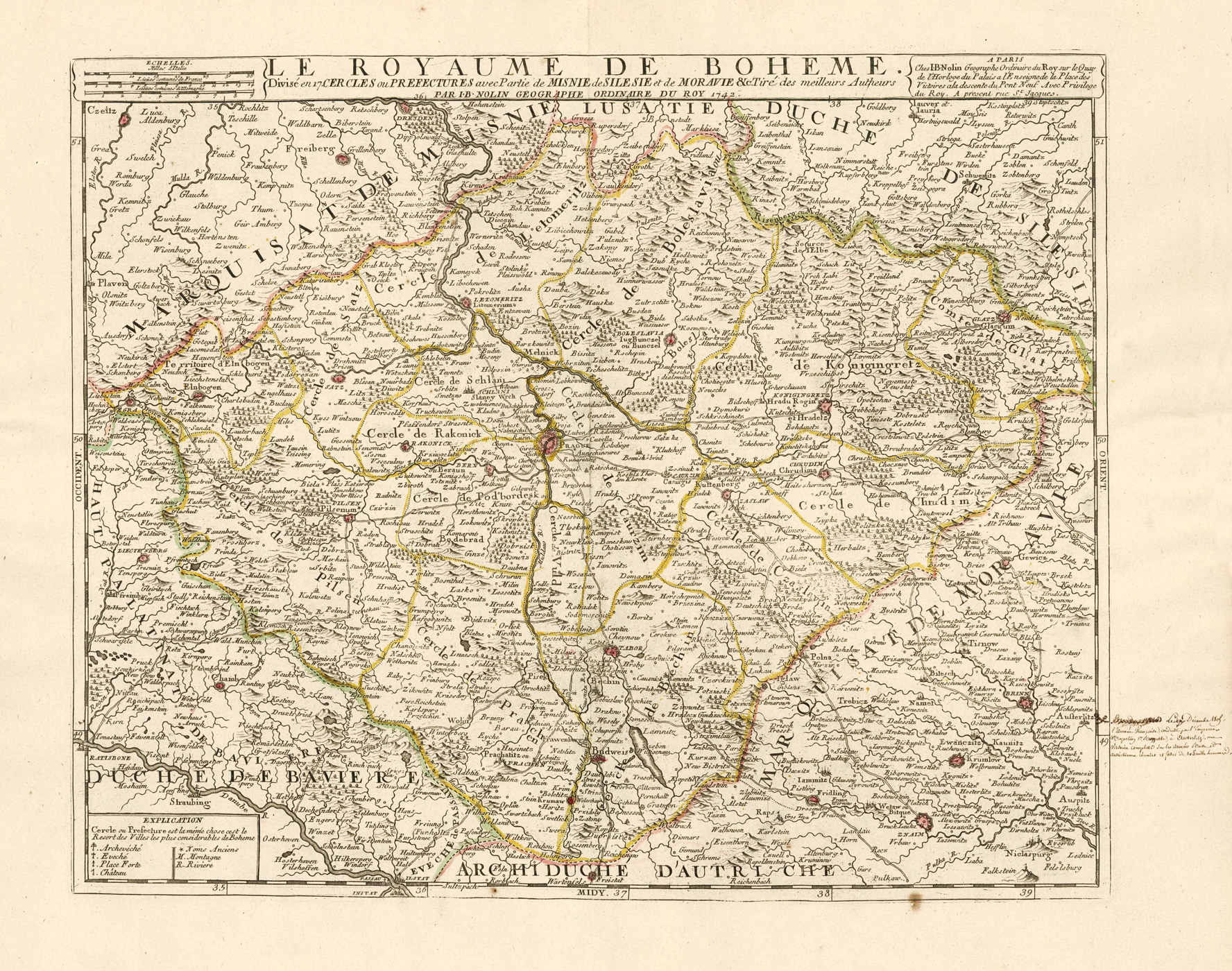 ‘Le Royaume De Boheme. Divisé en 17 Cercles ou Prefectures avec Partie de Misnie de Silesie et de Moravie & c. Tiré des meilleurs Autheurs Par I.B. Nolin Geographe Ordinaire Du Roy 1742. – A Paris Ches I.B. Nolin Geographe Ordinaire du Roy sur le Quay de l’Horloge du Palais a l’Enseignede la Place des Victoires ala descente du Pont Neuf Avec Privilege du Roy. A present rue St. Jacques.’: Altkolorierter Kupferstich b. Jean Baptiste Nolin Junior in Paris, dat. 1742, 44 x 54 cm