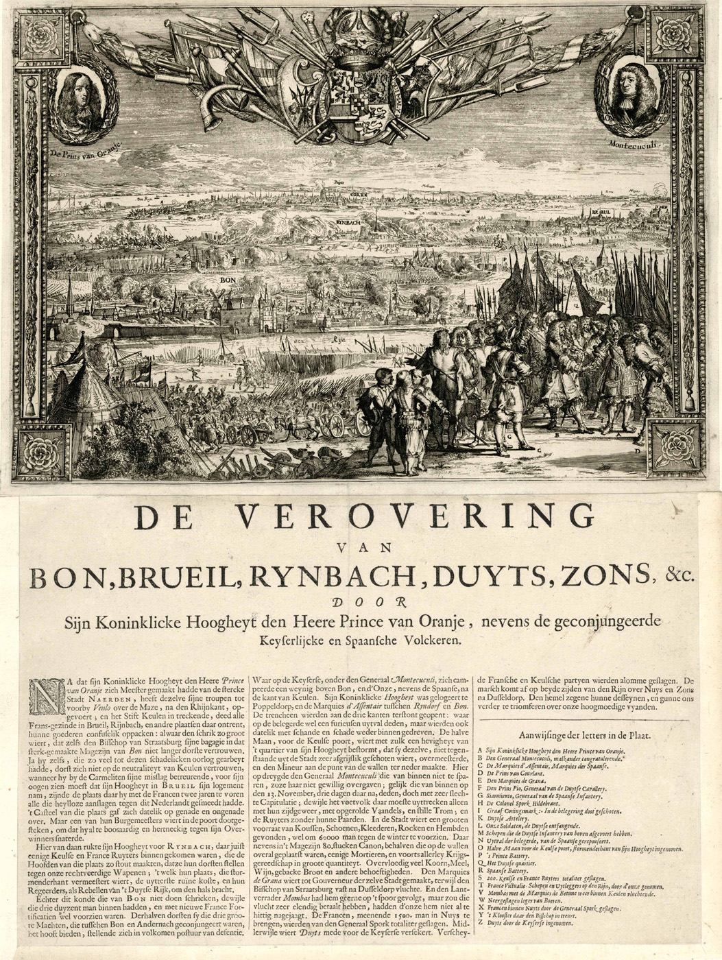 Landwehr 1973 – Romeyn de Hooghe the etcher, 79. – Zeigt die Eroberung von Bonn, Brühl, Rheinbach, Deutz, Zons usw. durch Seine Königliche Hoheit, den Prinzen von Oranien, zusammen mit den verbündeten kaiserlichen und spanischen Truppen. – Raimondo Montecuccoli spielte eine unterstützende Rolle bei der Belagerung von Bonn 1673, da die Belagerung unter seinem Kommando stand und er sie erfolgreich abschloss, indem er die französische Garnison besiegte und Bonn eroberte. – Oben rechts Porträt von Montecuccoli, oben links Porträt vom Prinzen von Oranien. – Flugblatt über den Französisch-Niederländischen Krieg und die Eroberung Bonns und anderer deutscher Städte durch niederländische und kaiserliche Truppen. – Im Vordergrund Truppen und verschiedene Militärführer, darunter Wilhelm von Oranien und Raimond Montecuccoli, die sich die Hand reichen, oben in der Mitte ein Wappen und Trophäen. – Unter der Ansicht 3spaltiger Text und Erklärungen von A – Z.