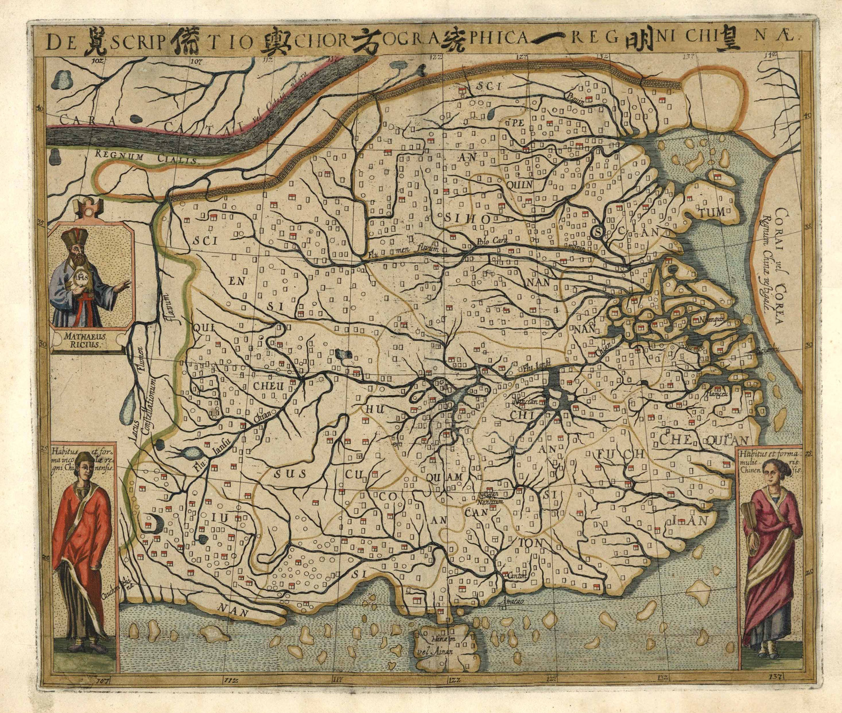 Caboara, Regnum Chinae, 20. – Die Karte ist eine leicht reduzierte Version der von Samuel Purchas im Jahre 1625 erschienen Karte in “His pilgrimes”. – Sie wurde in de Brys Historiarum orientalis (allgemein als Petits Voyages bekannt) veröffentlicht. Die Petits Voyages wurden von Erasmus Kempffer in Frankfurt von 1601 bis 1628 in dreizehn Teilen auf Deutsch und zwölf in Latein veröffentlicht. – Der Vater von Johann Theodore de Bry war der bekannte Theodore de Bry (1528-1598), ein flämischer Künstler, der als Kupferschmied und Graveur in der Stadt Lüttich im katholischen Teil der von Spanien kontrollierten südlichen Niederlande arbeitete. – Sein Sohn Johann Theodore behielt das Porträt des Jesuiten Matteo Ricci (Matthäus Ricci) auf dieser Karte bei, während John Crook später Ricci in der Karte entfernte, die der englischen Übersetzung von Álvaro Semedos im Jahr 1655 beigefügt ist. – Leichte Restaurierungen am unteren Rand. – Seltene Karte!