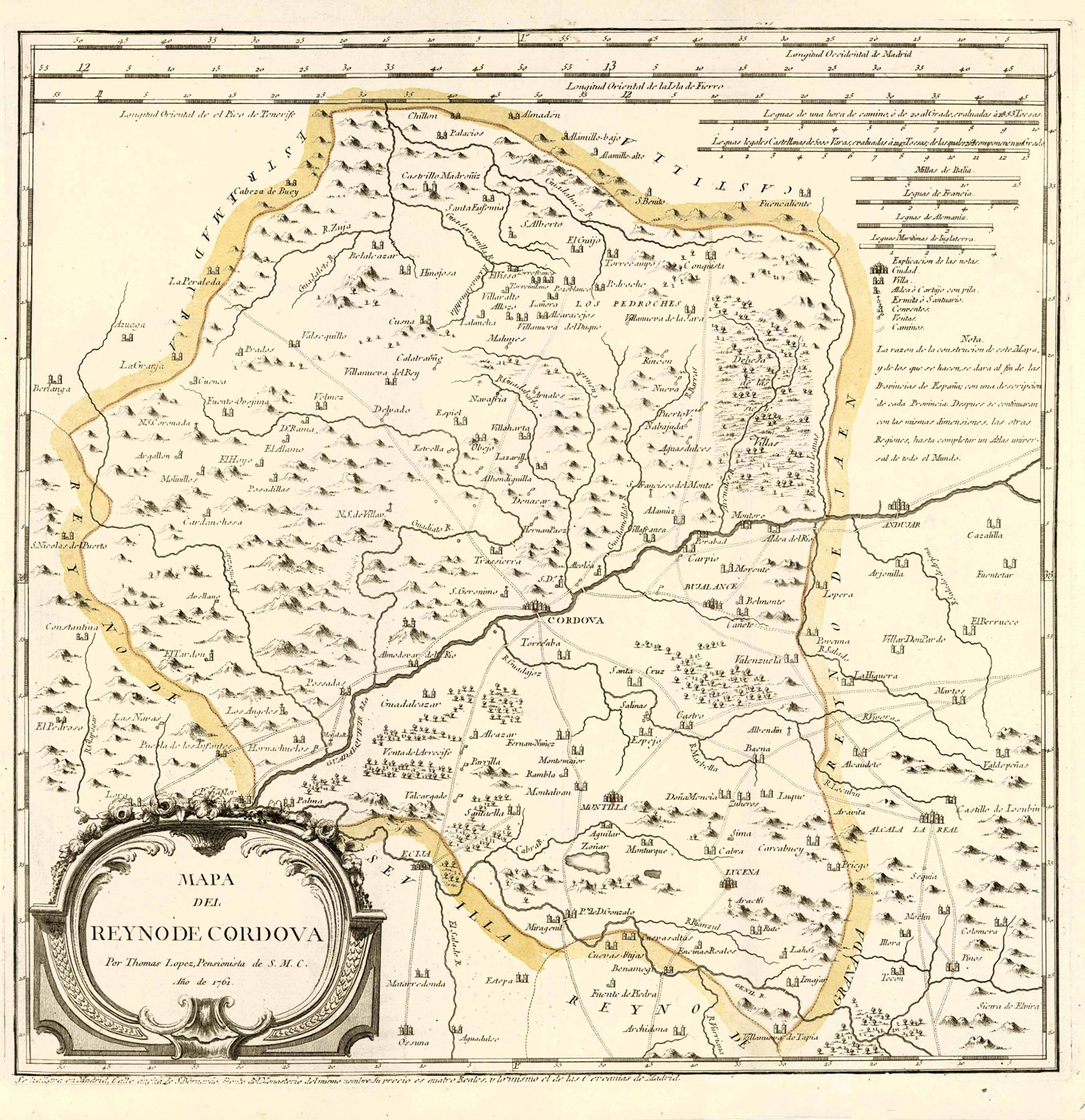 Carmen Manso Porto, Tercera parte Catálogo Atlas, Mapas sueltos y guías de Forasteros. – Zeigt das ehemalige Königreich Cordoba, die heutige Provinz Córdoba. – Unten links Titelkartusche. – Im Kartenhimmel Maßstäbe. – Am oberen rechten Rand Erklärungen.