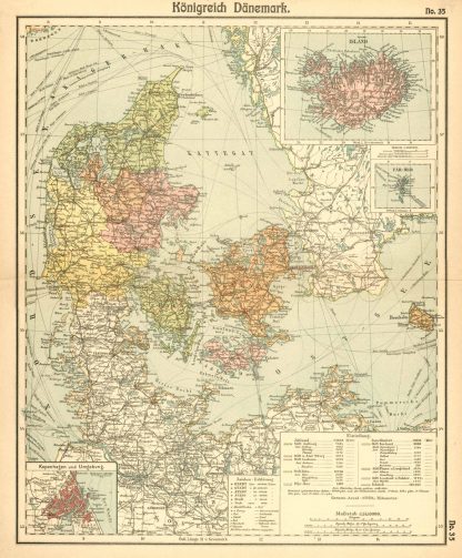 Zeigt Dänemark mit Schleswig-Holstein. – Oben rechts Insetkarte von Island. – Unten links Insetplan von Kopenhagen. – Unten rechts Einteilung, Erklärungen und Maßstab.