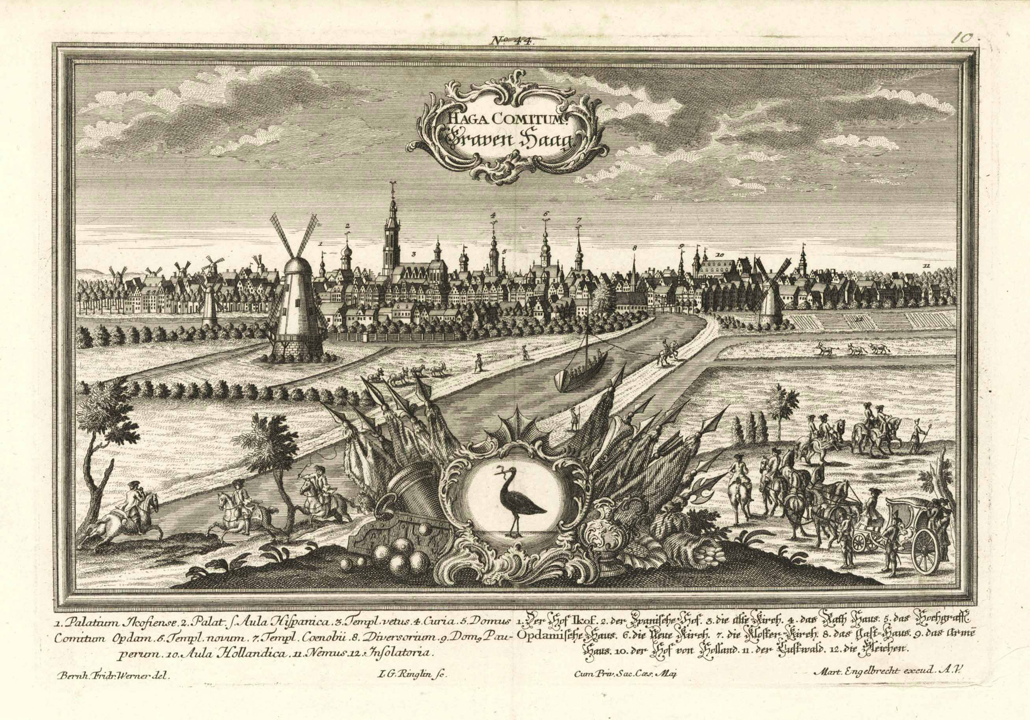 Gesamtansicht (‘Haga Comitum. Graven Haag.’), Kupferstich v. Johann Georg Ringlin (J.G. Ringle) n. Friedrich Bernhard Werner aus Ansichten berühmter Städte Europas b. Martin Engelbrecht in Augsburg, 1748, 21 x 30 cm