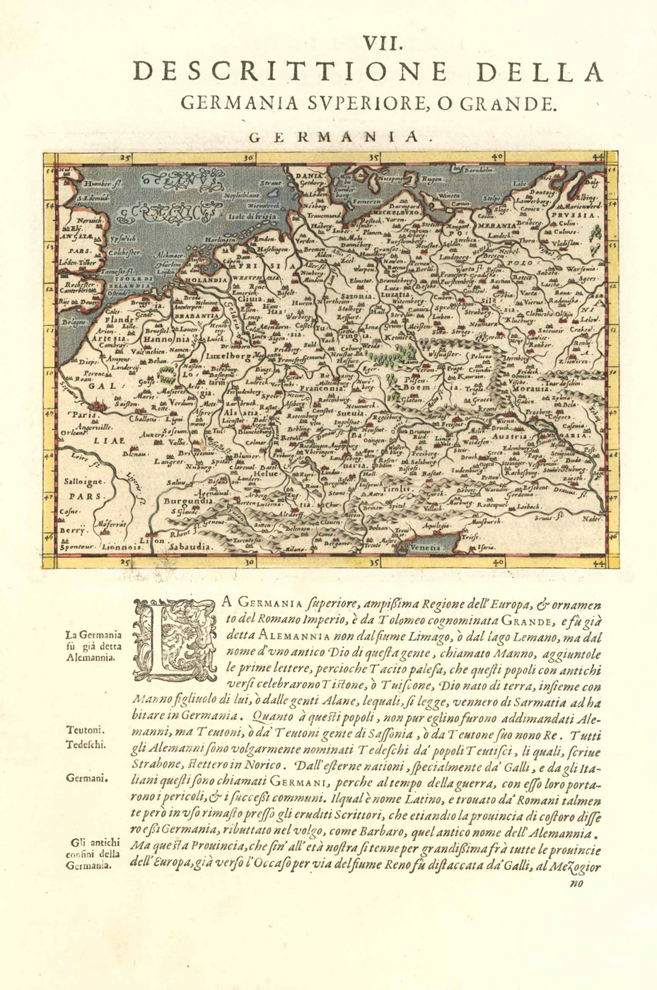 Meurer, Corpus der älteren Germania-Karten, 5.3.5. – Ganze Buchseite. – Zeigt Deutschland. – Magini schuf im Jahre 1596 die letzte bedeutende Neuarbeitung der ptolemeischen Geographia. – Porro stammte aus Padua und war in Rom und Venedig tätig.