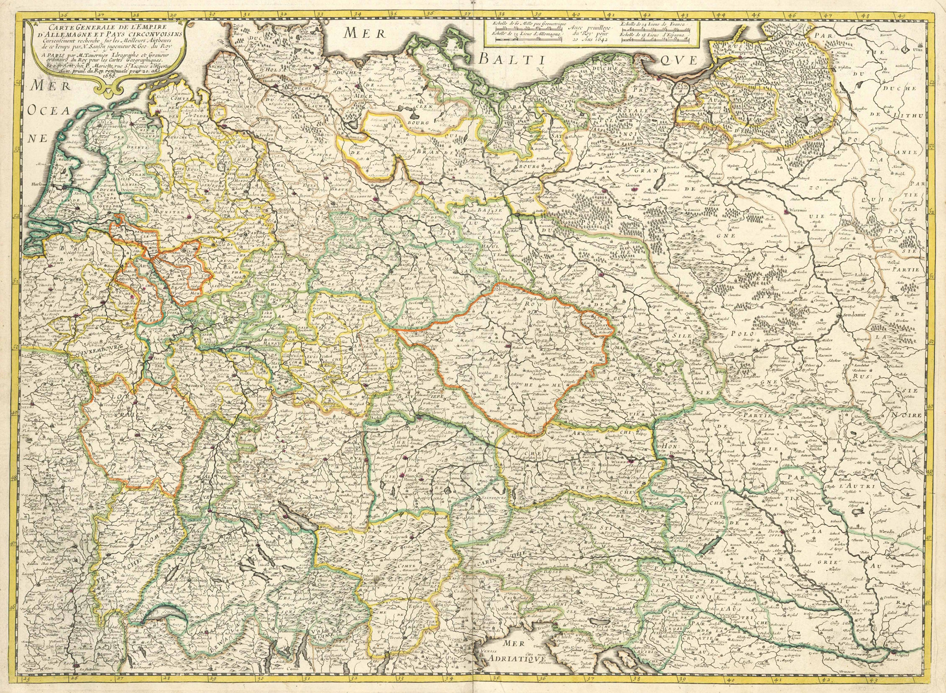 ‘Carte Generale De L’Empire D’Allemagne Et Pays Circonvoisins Curiensement recherche sur les Meilleurs Autheurs de ce temps par N. Sanson ingenieur & Geo. du Roy A Paris par M. Tavernier Idrographe et Graveur ordinaire du Roy pour les Cartes Geographiques. Et a present chez P. Mariette, rue St. Iacques a l’Esperance Avec. privil. du Roy. renouvelé pour 20. ans. 1658. – Avec privillege du Roy pour 20 Ans 1642’: Altkolorierter Kupferstich v. Melchior Tavernier n. Nicolas Sanson b. Pierre Mariette in Paris, dat. 1658, 41 x 56,5 cm