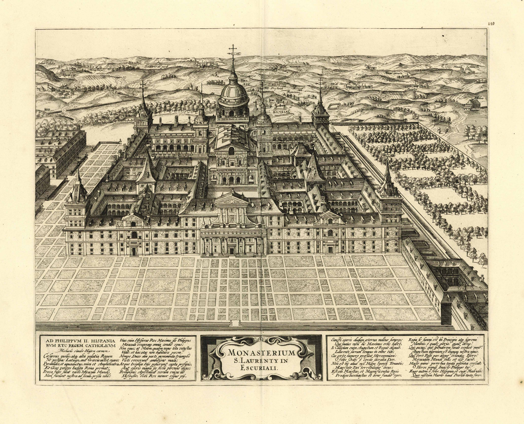 van der Krogt, Koeman’s Atlantes Neerlandici, Vol. IV-2, 1259 Escorial:41.2-4 (1. state) – Zeigt die Klosterresidenz San Lorenzo el Real de El Escorial, die im 16. Jahrhundert von Philipp II. von Spanien errichtet wurde in El Escorial etwa 60 Kilometer nordwestlich von Madrid. – Unten mittig unterhalb der Ansicht Vedutentitel; rechts und links flankiert von einem Gedicht an König Philipp II. in 4 Spalten von Michaelis van der Hagen. – Im Gegensatz zum Braun & Hogenberg jetzt mit veränderter Titelkartusche. – Verso kein Text und mit Nummer “110” oben rechts außerhalb der Ansicht in Manuskript. – Perfekter kräftiger Abzug der Platte und tadelloses Exemplar. – In diesem Zustand selten!