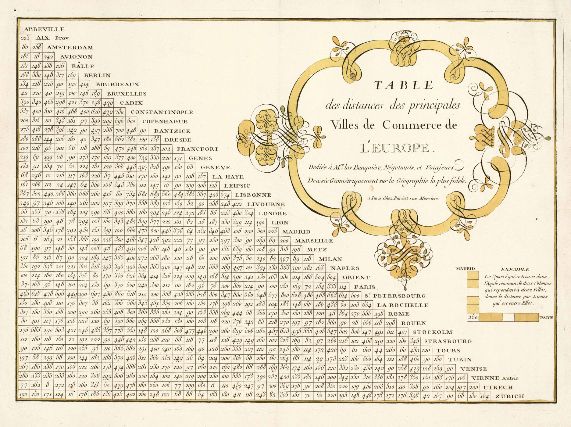Entfernungstabelle der wichtigsten Handelsstädte Europas. – Gewidmet den Bankiers, Kaufleuten und Reisenden. – Seltener Meilenzeiger mit den Städten Abbeville, Prov. Aix, Amsterdam, Bâlle, Berlin, Bourdeaux, Bruxelles, Cadix, Constantinople (Istanbul), Copenhague (Kopenhagen), Dantzik (Danzig), Dresde (Dresden), Francfort (Frankfurt), Genes (Genua), Geneves (Genf), La Haye (Den Haag), Lisbonne (Lissabon), Livourne (Livorno), Londre (London), Lion, Madrid, Marseille, Metz, Milan (Mailand), Naples (Neapel), Orient, Paris, St. Petersbourg, La Rochelle, Rome (Rom), Rouen, Stockolm (Stockholm), Strasbourg, Tours, Turin (Torino), Venise (Venedig), Vienne (Wien), Utrecht und Zurich (Zürich). – Selten!