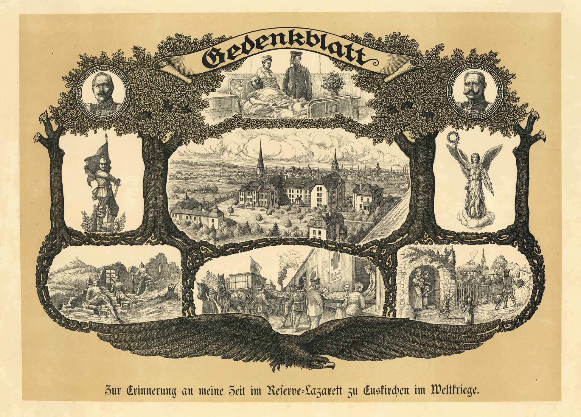 Sammelblatt mit mehreren Ansichten. – Mittig Ansicht von Euskirchen umgeben Lazarettwagen vom Roten Kreuz, Mann im Lazarett, Soldaten auf dem Schlachtfeld, Familie verabschiedet einen Soldaten, Porträt von Kaiser Wilhelm etc. – Die Bordüre mit deutschen Eichen und Adler.