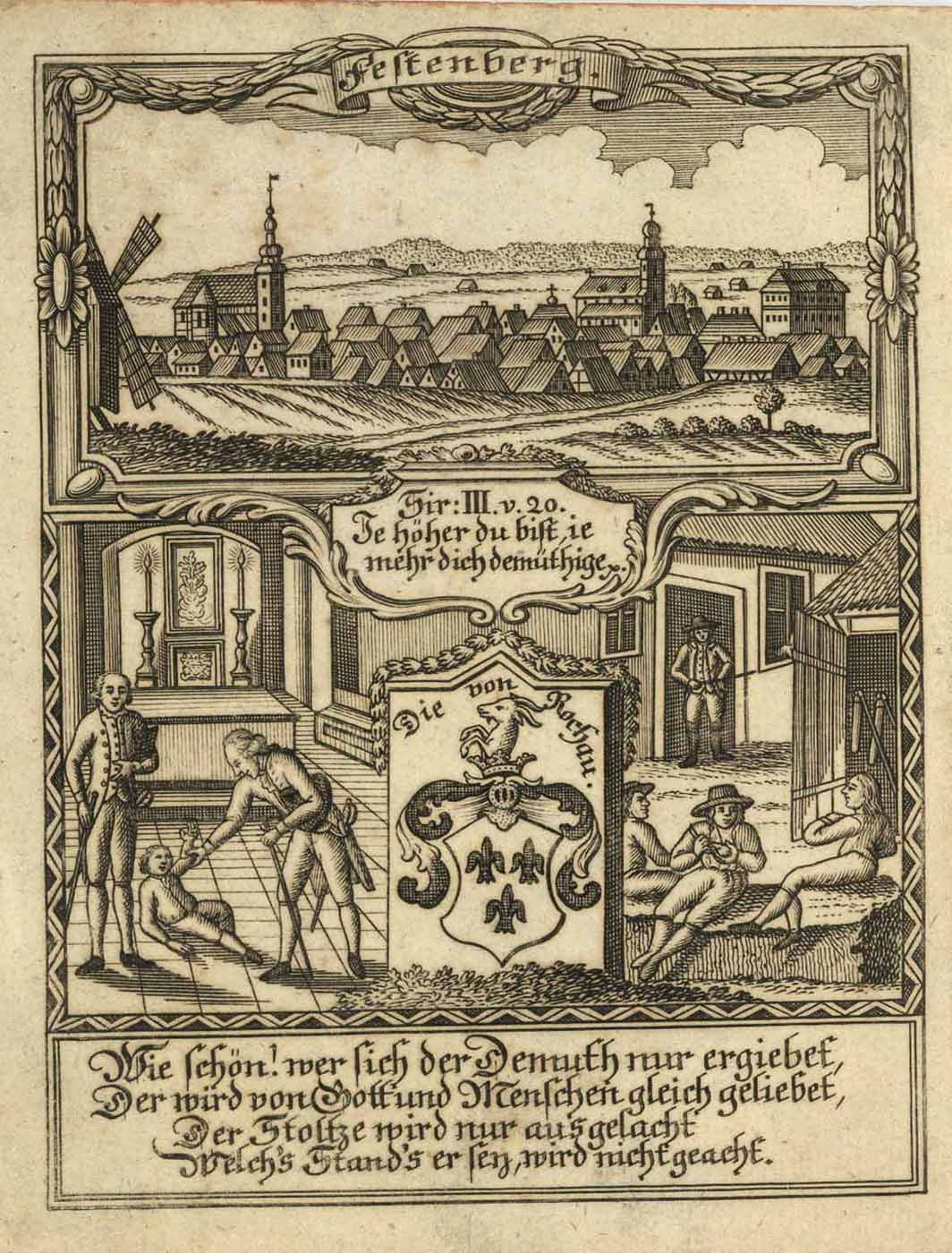 Gesamtansicht; darunter allegorische Darstellungen und Wappen der Familie Rochau (‘Festenberg.’), Kupferstich aus Zittausches monatliches Tagebuch, um 1780, 18 x 13,5 cm