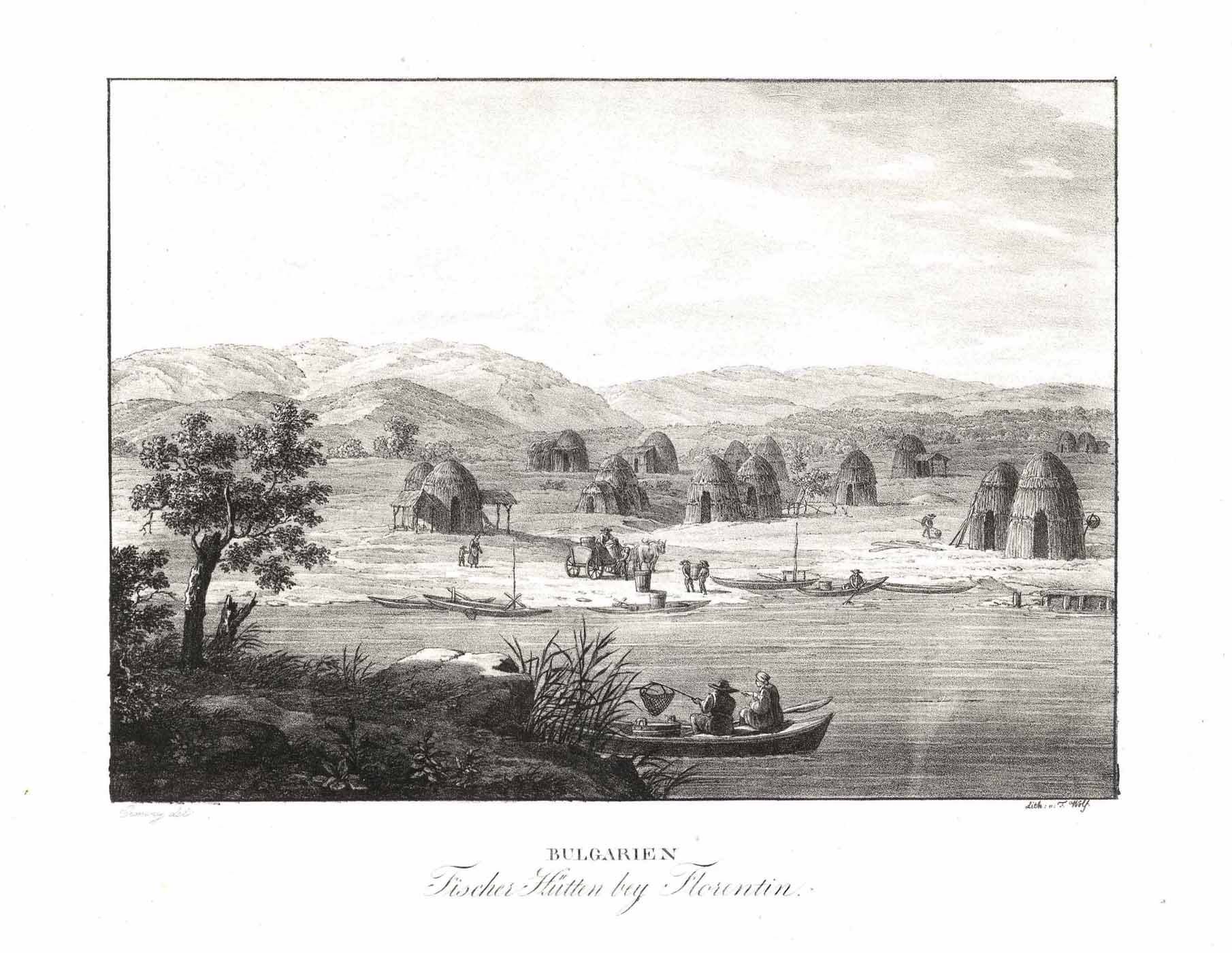 Fischer Hütten bei Florentin (‘Bulgarien – Fischer Hütten bey Florentin.’), Lithographie v. F. Wolf n. Erminy aus Zwey hundert vier und sechzig Donau-Ansichten … b. Leopold Grund in Wien, 1826, 29 x 35,5 cm