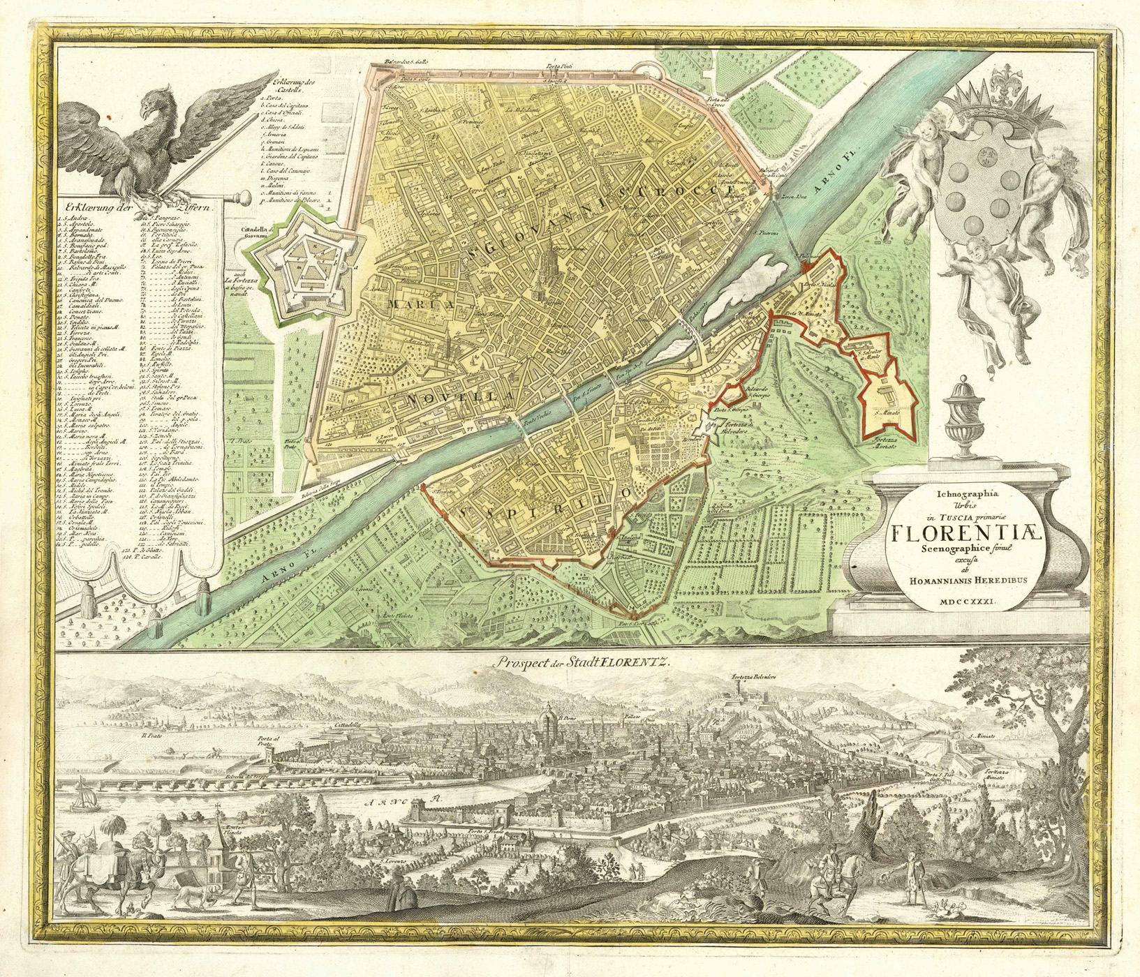 Sandler, Johann Baptista Homann, Die Homännischen Erben, Matthäus Seutter und Ihre Landkarten, S. 130, 25. – Im unteren Drittel Panorama der Stadt (“Prospect der Stadt Florentz”); darüber Stadtplan mit Erklärungen, Wappen und Titelkartusche.
