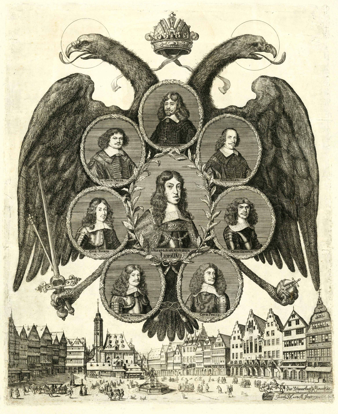 Römerberg; darüber Kaiser Leopold II umgeben von den Kurfürsten von Mainz, Köln, Sachsen, Kurpfalz, Brandenburg, Bayern und Trier einfasst von einem gekrönten Doppelkopfadler mit Zepter und Reichsapfel in den Krallen (‘Der Römerberg zu Franckfurt.’), Kupferstich b. Jacob Planell, n. 1790, 45,5 x 37,5 cm