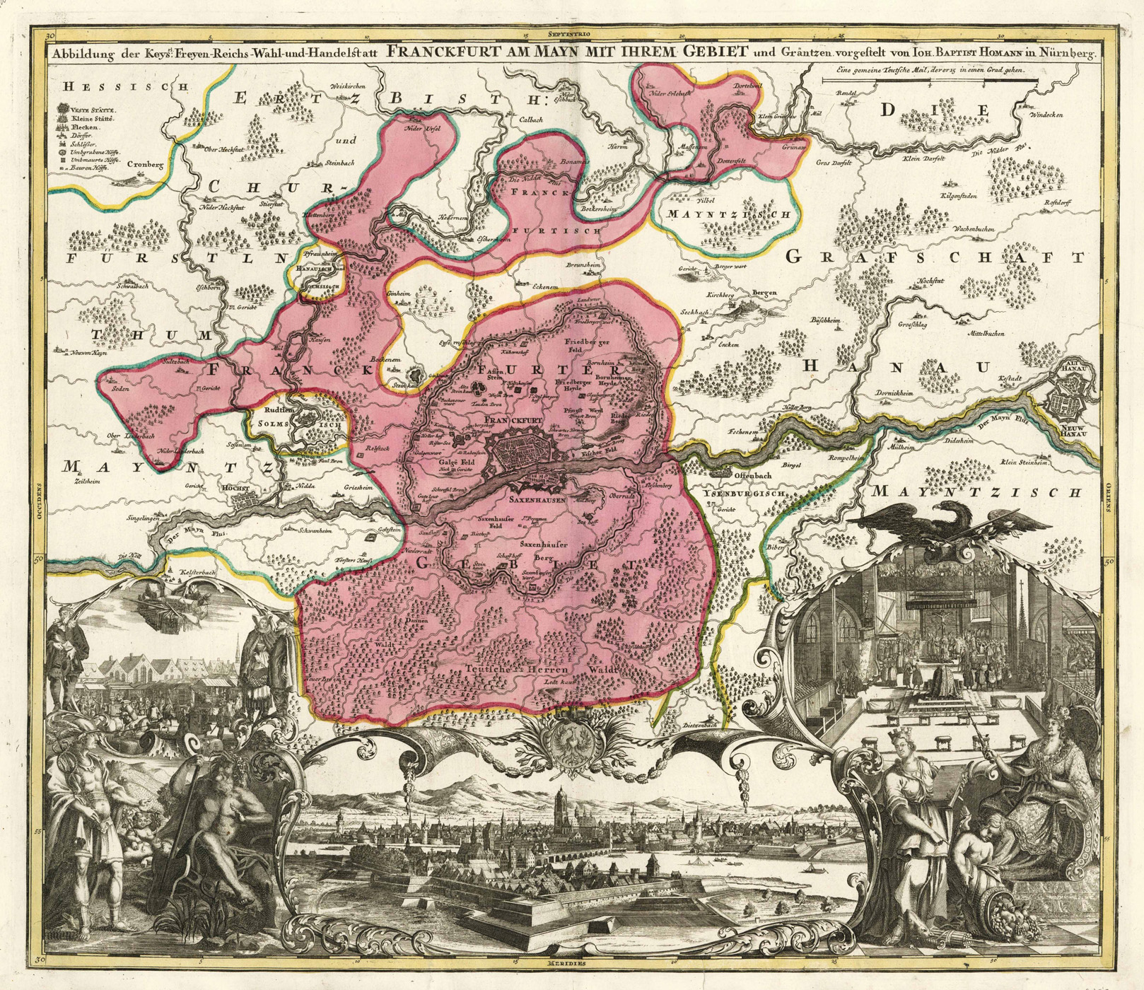 Sandler, Johann Baptista Homann, Die Homännischen Erben, Matthäus Seutter und Ihre Landkarten, S. 59, 84. – Umgebungskarte des Frankfurter Gebiets sowie dem Mainlauf von Kelsterbach bis Hanau. – Darunter Gesamtansicht mit seitlichen figürlichen Allegorien und Ansicht des Römers mit Marktbetrieb sowie Krönungsszene im Dom. – 1. Zustand ohne Privileg.