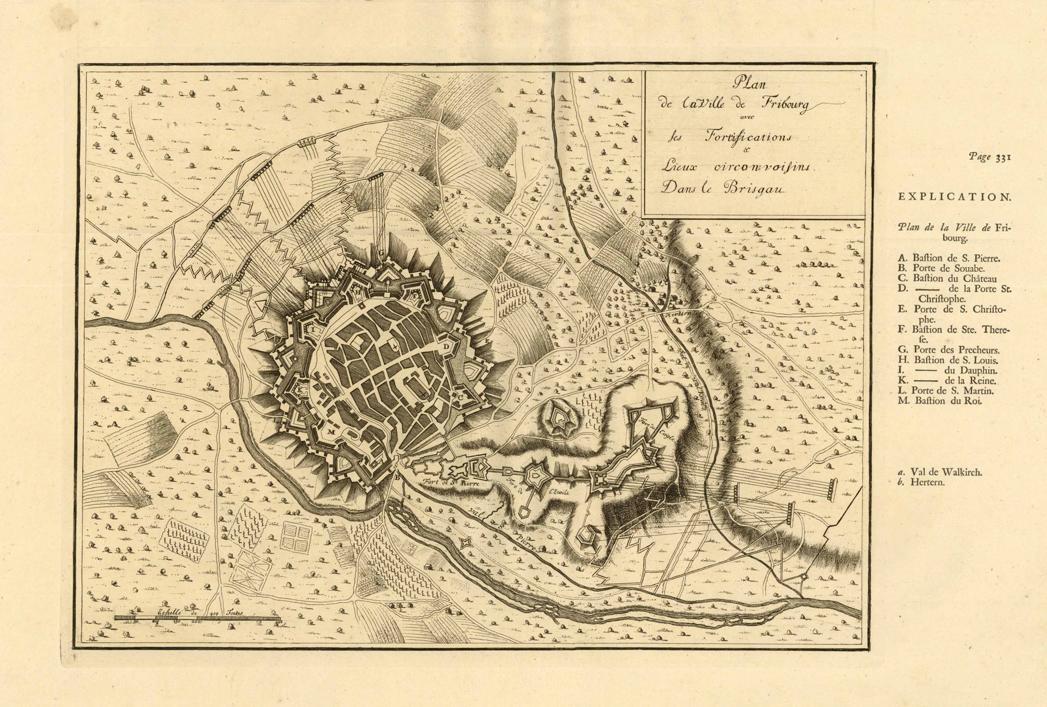 Befestigungsplan mit Umgebung (‘Plan de la Ville de Fribourg avec les Fortifications & Lieux circonvoisins Dans le Brisgau’), Kupferstich aus Histoire militaire du Prince Eugene de Savoye, du Prince et Duc de Marlborough b. Isaac van der Kloot in Den Haag, 1729, 27 x 42 cm