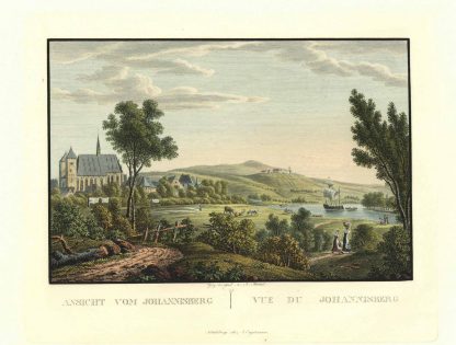 Ansicht von Westen auf Geisenheim und den Johannesberg; im Vordergrund links die Kirche von Geisenheim mit noch unfertigen Türmen (‘Ansicht vom Johannisberg – Vue de Johannisberg’), aquarellierter Kupferstich auf Whatman-Bütten v. Jakob Roux b. J. Engelmann in Heidelberg, um 1826, 15,5 x 21,5 cm