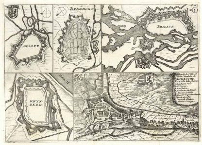 Befestigungsplan von Geldern, Roermond (Niederlande), Breisach, Rheinberg u. Limbourg (Belgien), Kupferstich aus Atlas portatif, ou le Theatre de la Guerre en Europe. … b. Daniel De La Feuille in Amsterdam, 1702, 17,5 x 24,5 cm