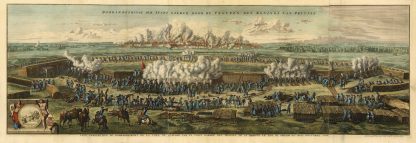Panorama der Stadt mit der Beschießung im Jahre 1703 (‘Bombardeeringe Der Stadt Gelder, Door De Troupen Des Konings Van Pruysse – Veüe Perspective Du Bombardement De La Ville De Gueldre Par Un Corps D’Armee Des Troupes De Sa Maieste Le Roy De Prusse Au Mois D’Octobre 1703’), kolorierter Kupferstich v. Jan van Huchtenburgh n. D. de Bodt aus Histoire militaire du Prince Eugene de Savoye, du Prince et Duc de Marlborough b. Isaac van der Kloot in Den Haag, 1729, 46,5 x 145,5 cm