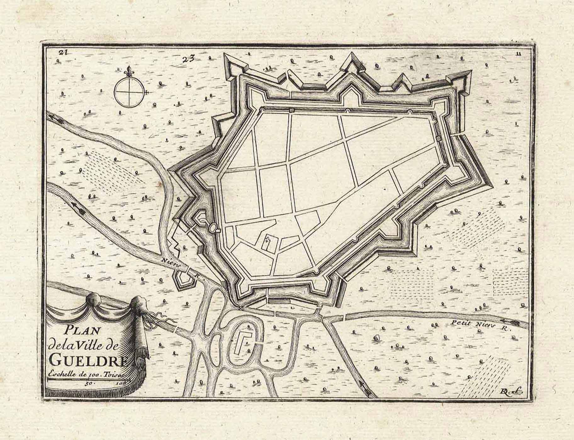 Befestigungsplan (‘Plan de la Ville de Gueldre. – 21 – II – RD. f.’), Kupferstich v. Des Roches aus Les Plans et Profils des principales Villes et lieux considerables du Duche de Gueldre b. Sebstian de Beaulieu in Paris, v. 1674, 11 x 15 cm