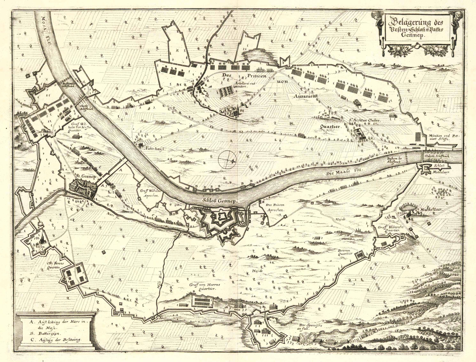 Vogelschauansicht u. Befestigungsplan vom Schloß mit Karte der Umgebung u. Truppenstellungen (‘Belägerung des Vesten Schloß u. Passes Gennep.’), Kupferstich v. Matthäus Merian aus Merians Theatrum Europaeum, 1648, 27,5 x 36,5 cm