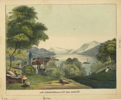 Gesamtansicht mit Blick auf den Vierwaldstättersee (‘Gersau am Vierwaldstätter See.’), altkolorierte Lithographie, um 1860, 15,5 x 19 cm
