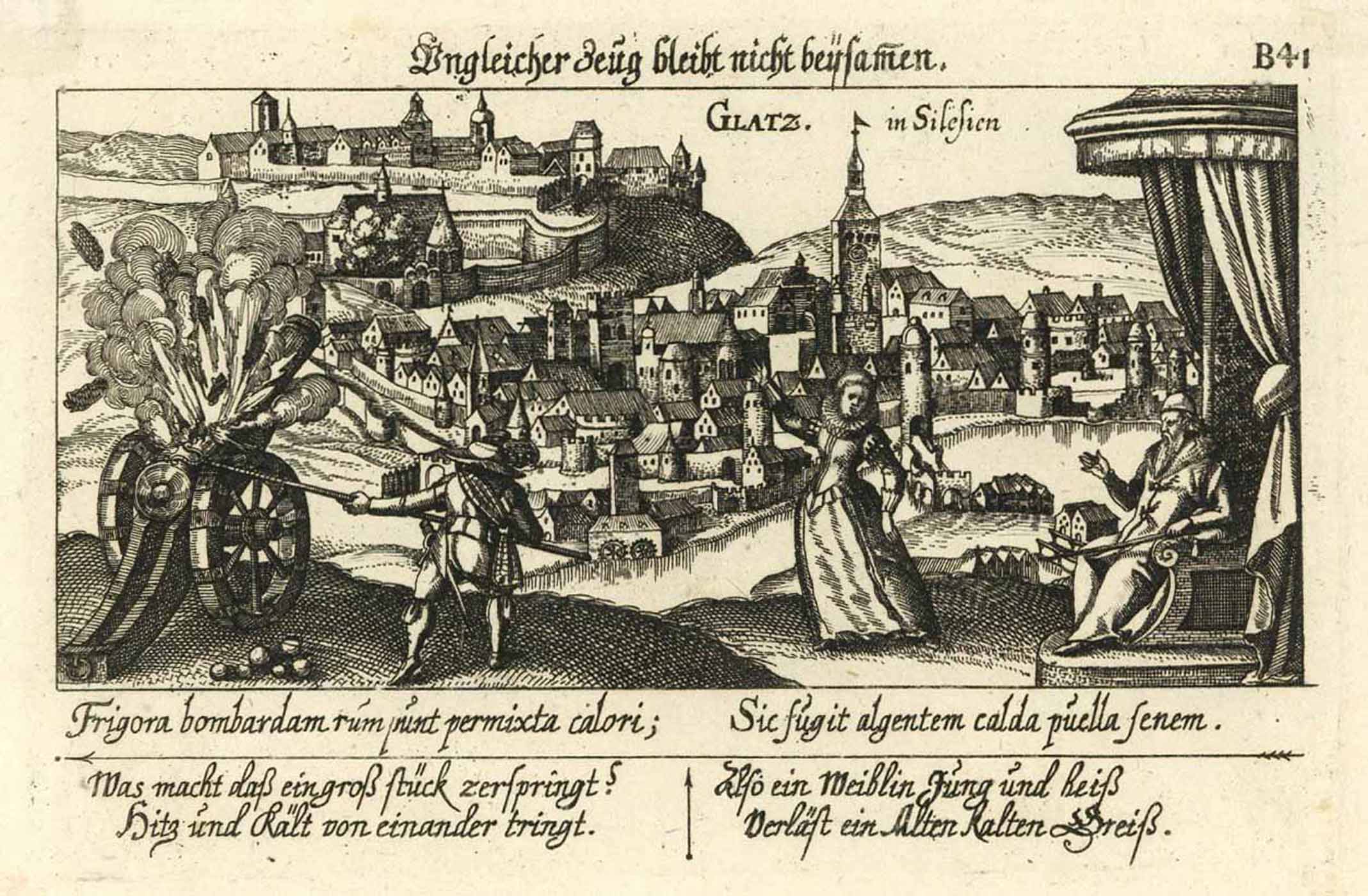 Gesamtansicht (‘Glatz in Silesien’), Kupferstich aus Thesaurus Philo-Politicus … (Meisner Schatzkästlein) b. Paulus Fürst in Nürnberg, 1638, 10 x 15 cm