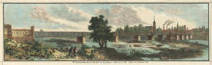 Gesamtansicht mit der Eisenbahnbrücke über die Alte Oder (‘Die Eisenbahnbrücke über die alte Oder bei Groß-Glogau, eröffnet am 17. Mai. Erbaut vom Baumeister Bail.’), kolorierter Holzstich b. Weber, 1858, 10,5 x 35,5 cm
