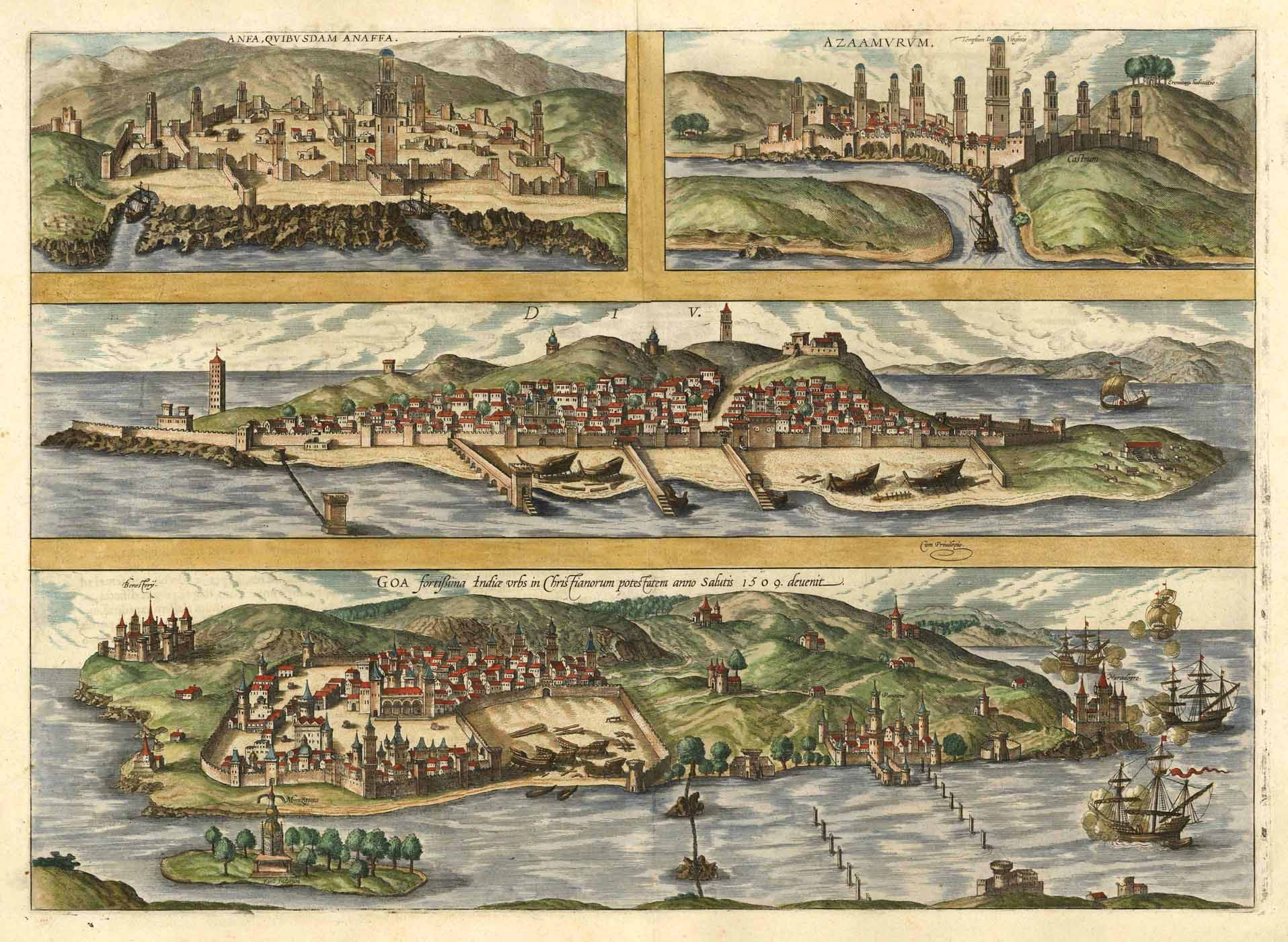 van der Krogt, Koeman’s Atlantes Neerlandici, Vol. IV, 805. – Zeigt 4 Ansichten auf einem Blatt (Casablanca / Marokko (Anfa), Azemmour / Marokko, Diu / Indien – Goa / Indien. – Shows 4 views on one sheet (Casablanca / Morocco (Anfa), Azemmour / Morocco, Diu / India – Goa / India.