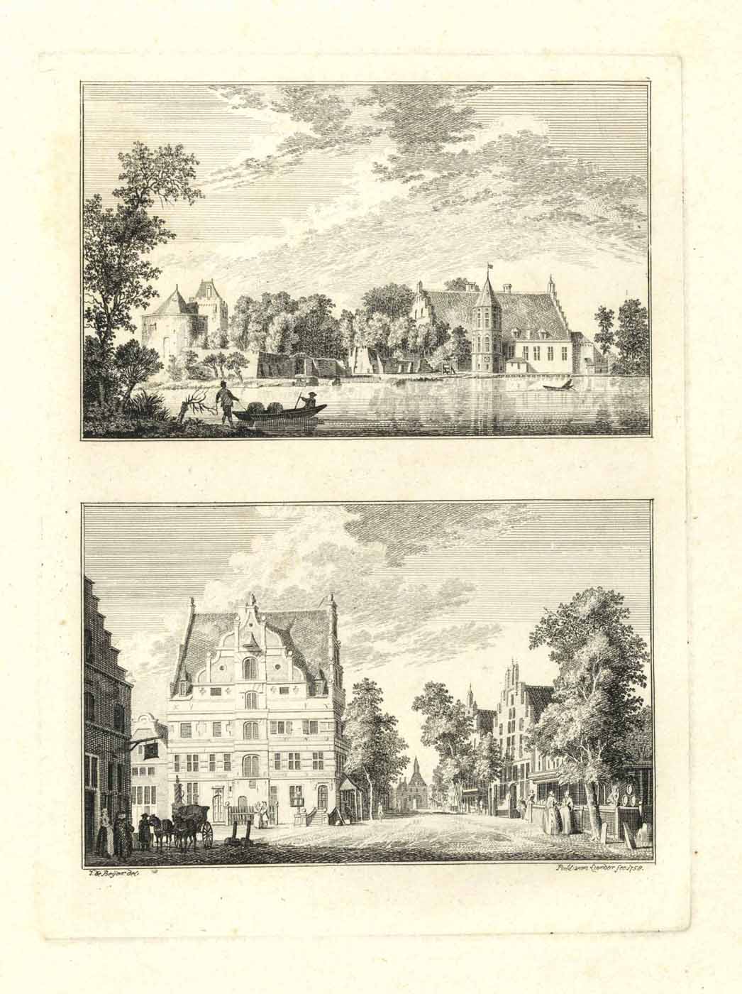 Rathaus und Kastell, Kupferstich v. van Liender n. de Beyer, 1758, 18 x 13,5 cm