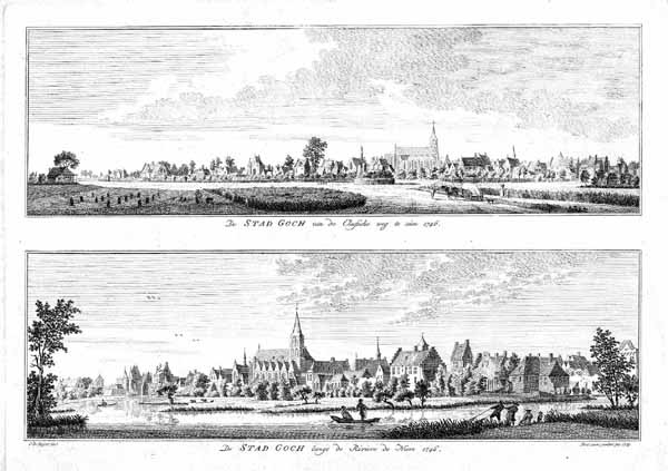 Gesamtansicht von Norden und Nordwesten (‘De Stad Goch van de Cleefsche weg te zien 1746’ und ‘De Stad Goch langs de Riviere de Niers 1746.’), Kupferstich v. van Liender n. de Beyer, 1759, 18 x 26 cm