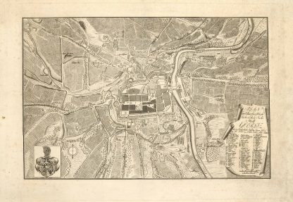 Unten rechts Titelkartusche mit Erklärungen zu dem Reichenbacher Viertel, Frauen Viertel, Neiss Viertel, Nickels Viertel und Röhr Bütten. – Mit Auflistung der Kirchen, Stadttore, Gassen, Märkte und öffentliche Gebäude. – Unten links Stadtwappen. – Extrem selten!