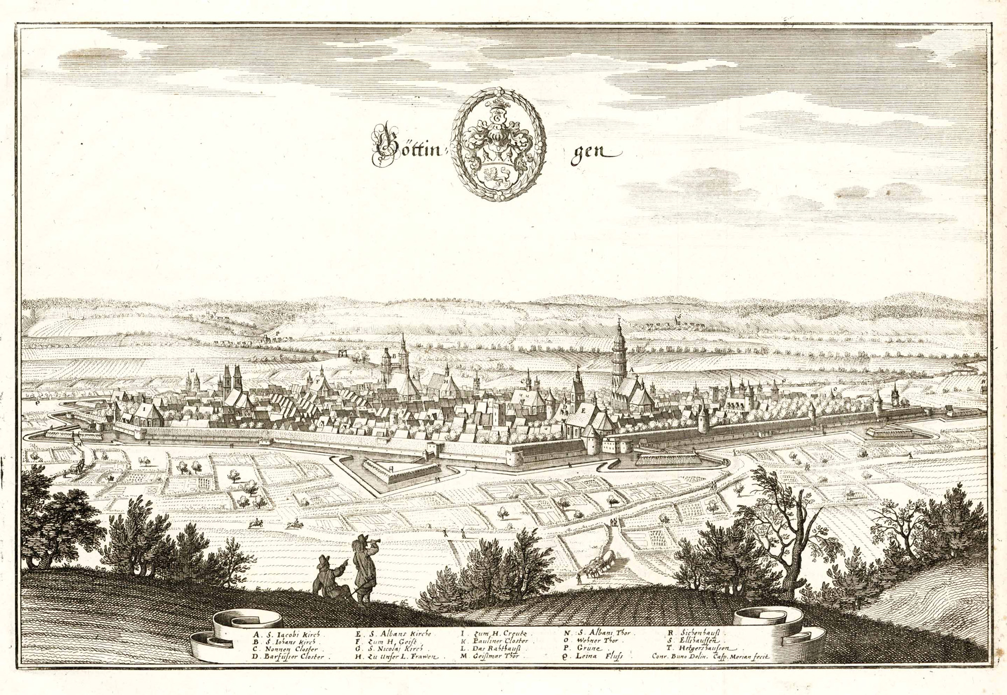 Fauser, Repertorium älterer Topographie. Druckgraphik von 1486 bis 1750, 4745. – Gesamtansicht von Osten, im Hintergrund Greene und Elliehausen sowie der Solling, im Himmel das Stadtwappen. – Am Unterrand Erläuterung der wichtigsten Gebäude.