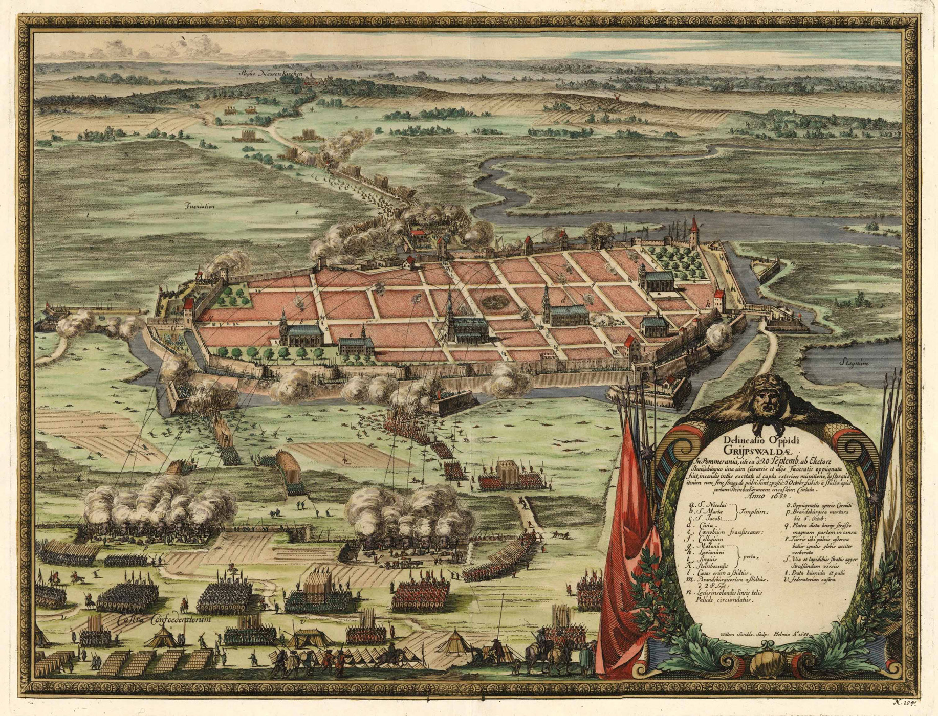 Vogelschauplan mit Einzeichnung der wichtigsten Gebäude der Stadt und Belagerung im Jahre 1659 (‘Delincalio Oppidi Grijpswaldae … Anno 1659’), kolorierter Kupferstich umgeben mit Barockrahmen v. Willem Swidde in Stockholm aus De Rebus a Carolo Gustavo Sveciae Regestis, dat. 1688 ersch. 1696, 28,5 x 37 cm