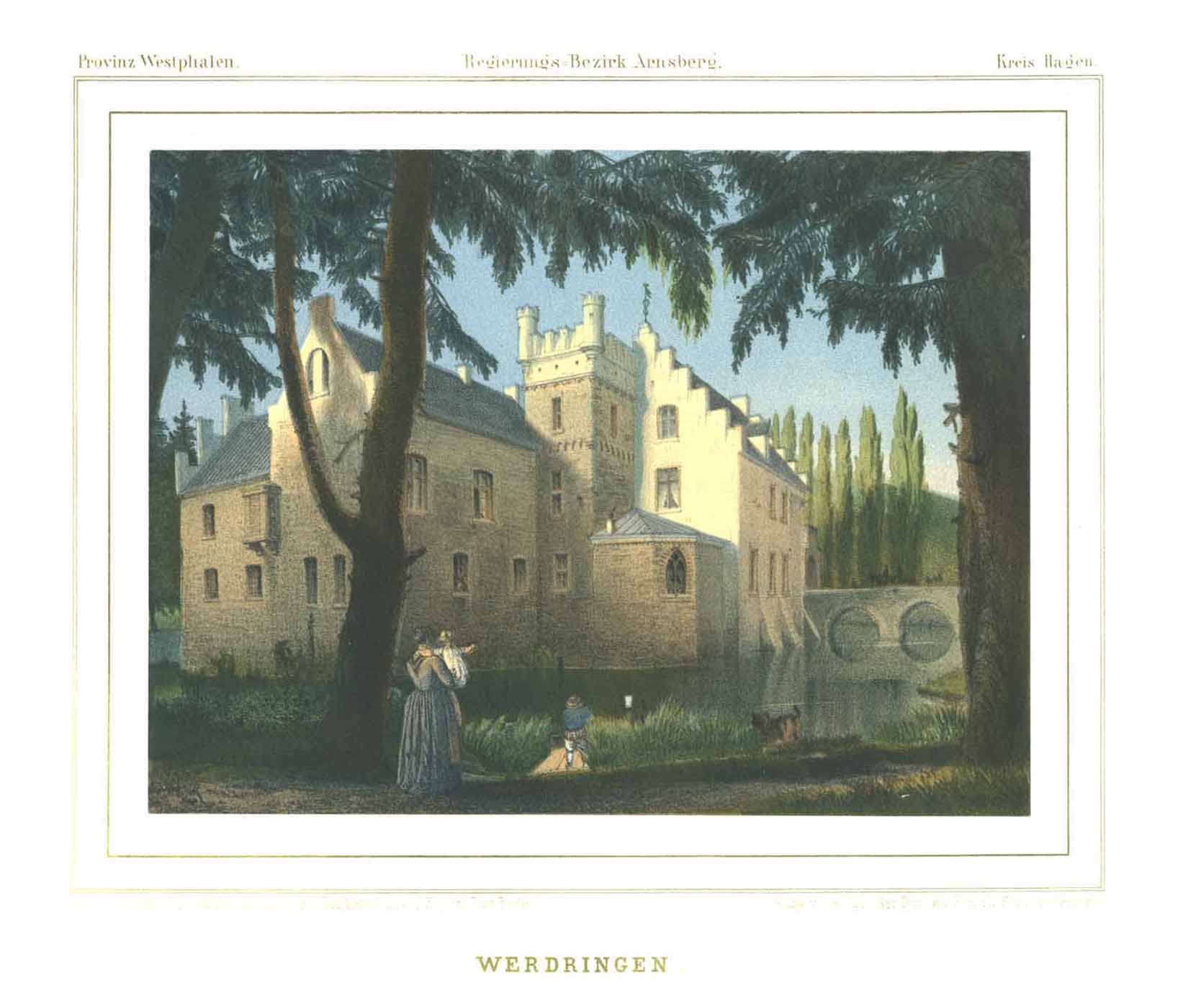 Wasserburg Werdringen, Farblithographie aus Duncker, 1857, 21x 23,5 cm