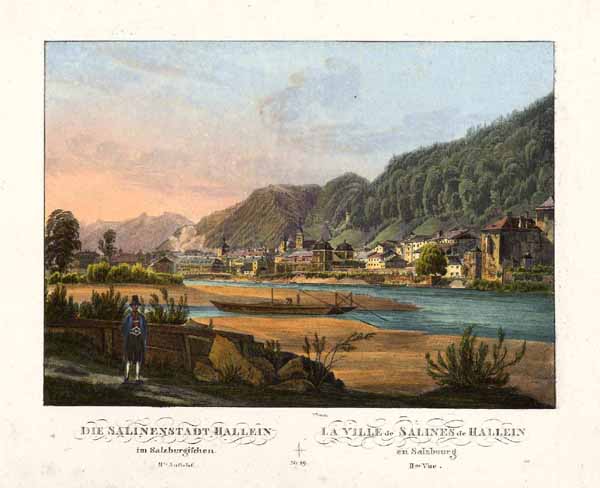 Gesamtansicht (‘Die Salinenstadt Hallein im Salzburgischen IIte Ansicht. – La Ville de Salines de Hallein en Salzbourg IIde Vue. – N. 29.’), altgouachierte Lithographie v. Jakob Alt gedr. b. Mansfeld & Comp. in Wien, 1833, 19,5 x 23,5 cm