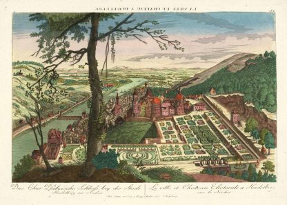 Gesamtansicht vom Schloß und Gartenanlage mit Blick auf die Stadt und den Neckar (‘Das Chur Pfälzische Schloss bey der Stadt Heidelberg am Neckar. – La ville et Chateau Electorale a Heidelberg sur le Necker’), altkolorierter Kupferstich b. Dominicus Fietta in Kriegshaber bei Augsburg, um 1795, 28 x 38,5 cm
