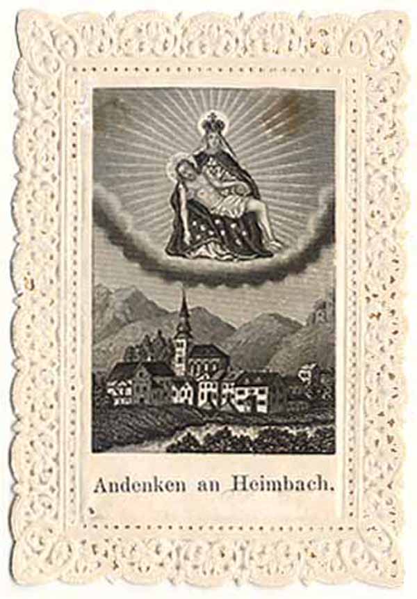 Gesamtansicht mit Kirche und Burg über die Rur gesehen; im Himmel die Muttergottes mit dem Leichnam Jesu (‘Andenken an Heimbach’), Stahlstich mit Spitzenrand, um 1860, 8 x 5,5 cm