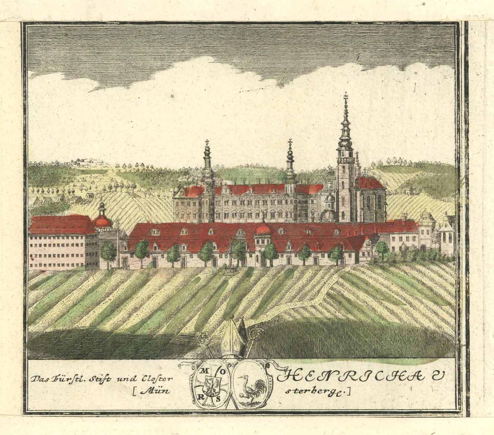 Zisterzienserkloster Heinrichau (‘Das Fürstl. Stift und Closter Henrichau – Münsterberg.’), altkolorierter Kupferstich v. Friedrich Bernhard Werner aus Scenographia Urbium Silesiae b. Homann Erben in Nürnberg, 1737-1752, 14,5 x 16 cm