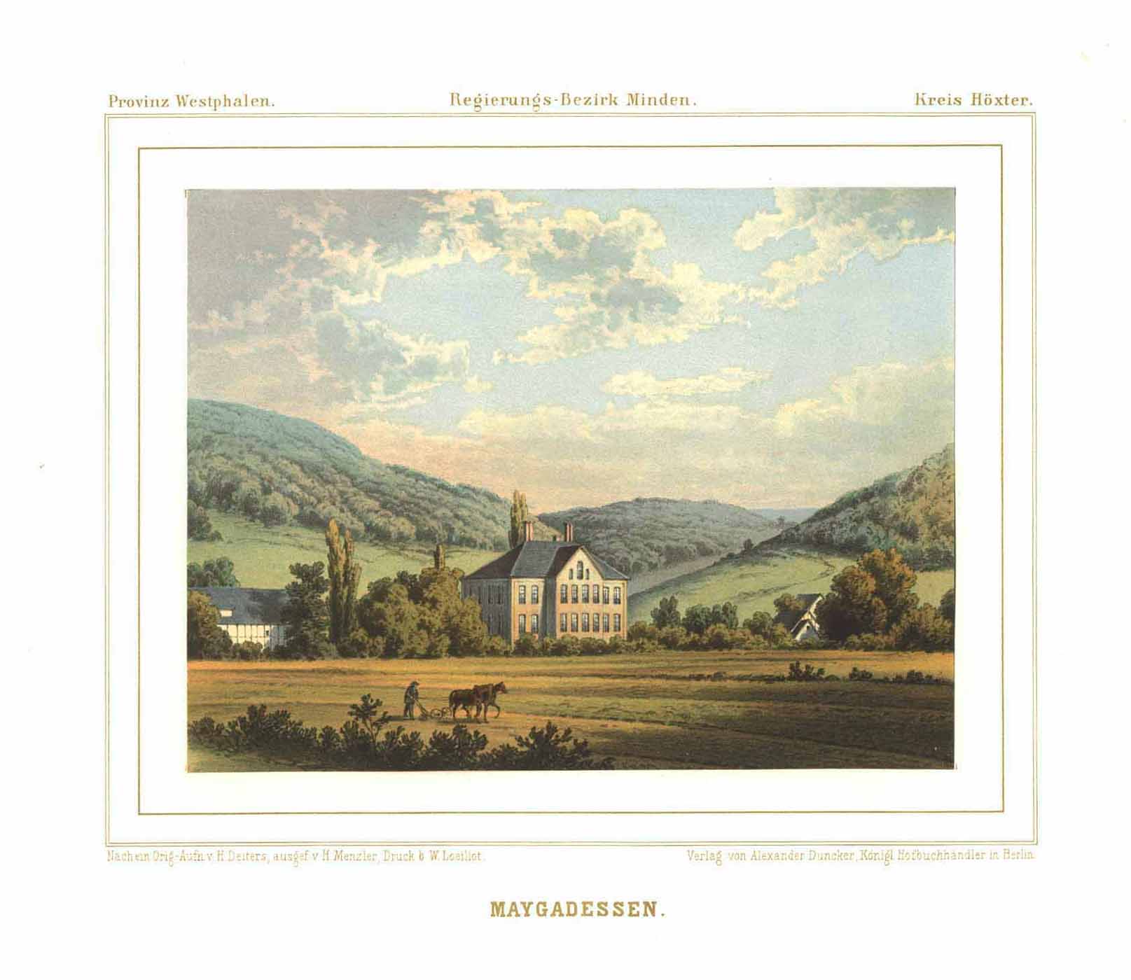 Herrenhaus Maygadessen, Farblithographie aus Duncker, 1865, 18,5 x 23,5 cm