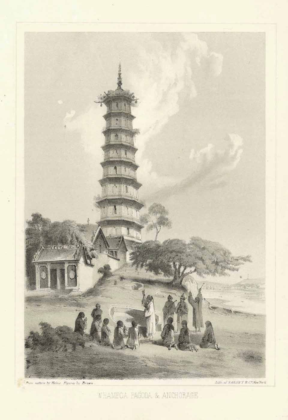Whampoa Pagoda & Anchorage, Lithographie in Grautönen v. Sarony in New York n. Heine & Brown, 1856, 24 x 17 cm