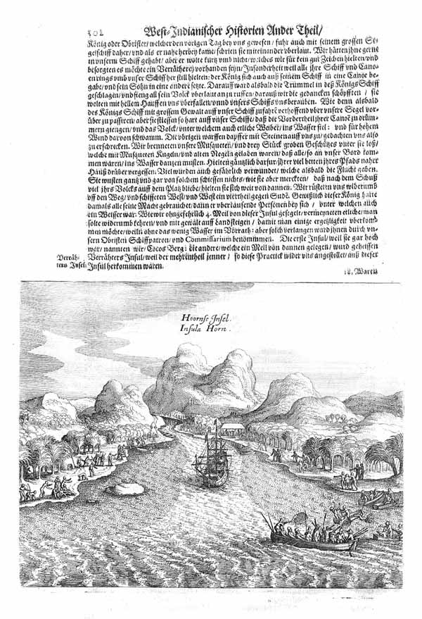 Ansicht der Insel mit Segelschiff und Beibooten im Vgr. (‘Hoornse Insel. Insula Horn.’), Kupferstich aus Historia Antipodum oder Newe Welt b. Matthäus Merian in Frankfurt a.M., 1655, 15 x 19 cm (Ganze Buchseite)