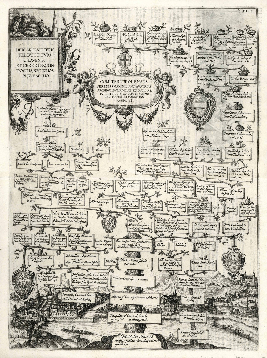 Gesamtansicht; darüber Stammbaum (‘Comites Tirolenses …’), Kupferstich v. Dominicus Custos b. Antonio Albizzi in Augsburg, 1609, 54 x 39,5 cm