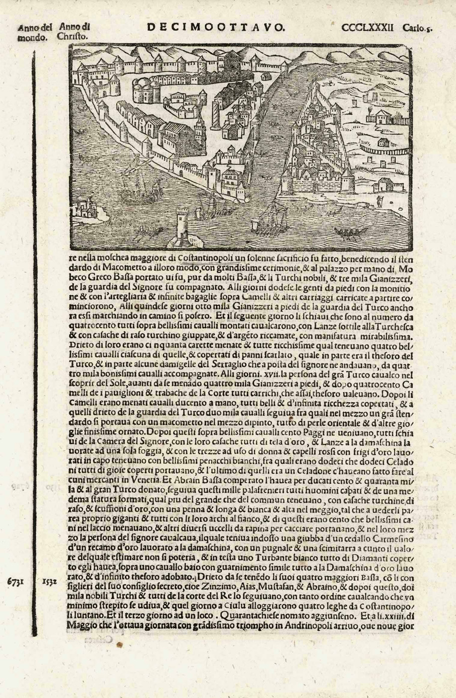 Gesamtansicht aus der halben Vogelschau (‘… Costantinopoli …’), Holzschnitt aus Supplementrum chronicarum b. Jacobus Philippus (Foresti) de Bergamo, 1553, 9 x 14,5 cm