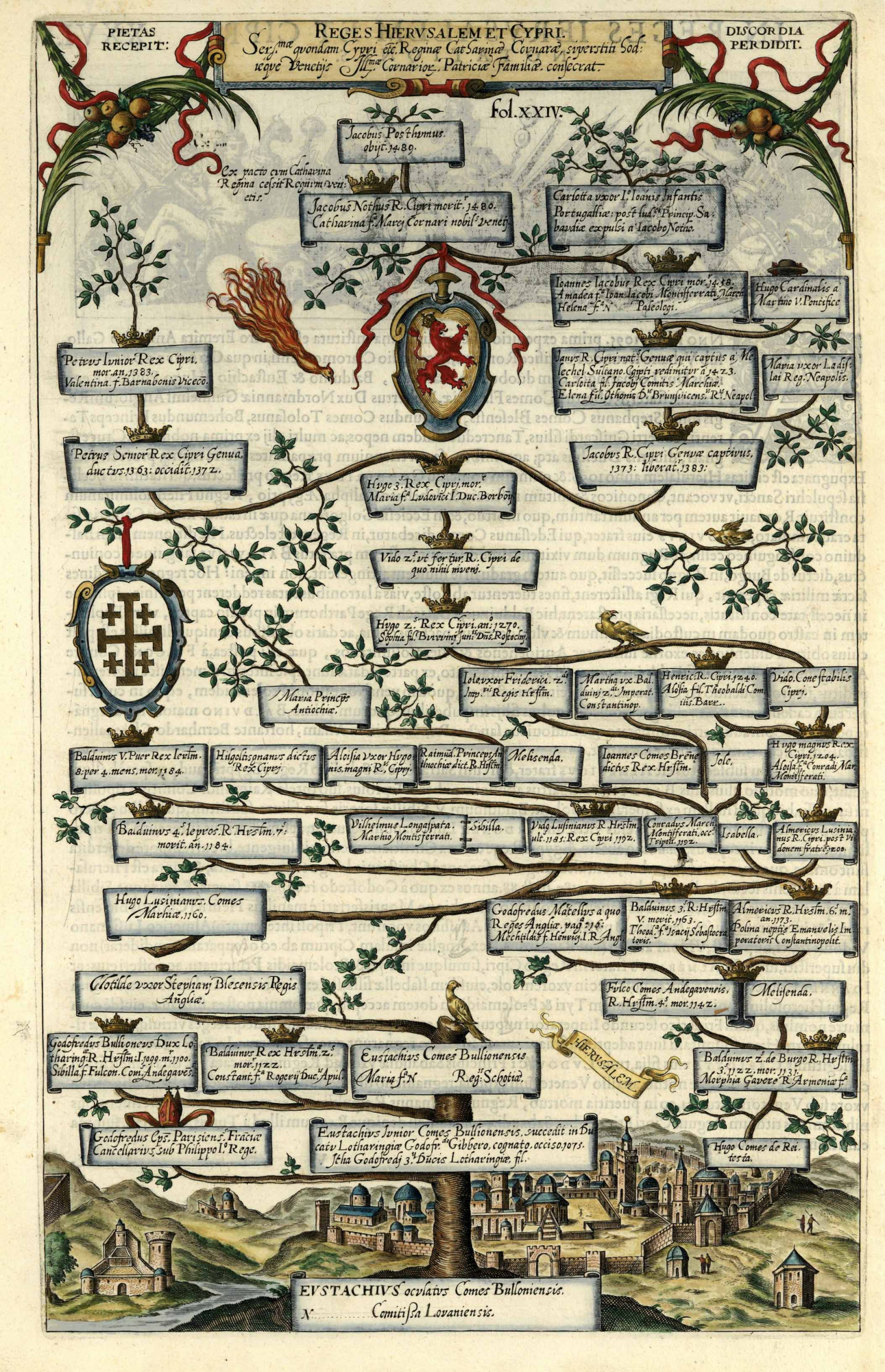 1. Ausgabe. – Zeigt einen Stammbaum der Könige von Jerusalem und Zypern. – Unter dem Stammbaum Ansicht von Jeruslaem (“Hierusalem.”)