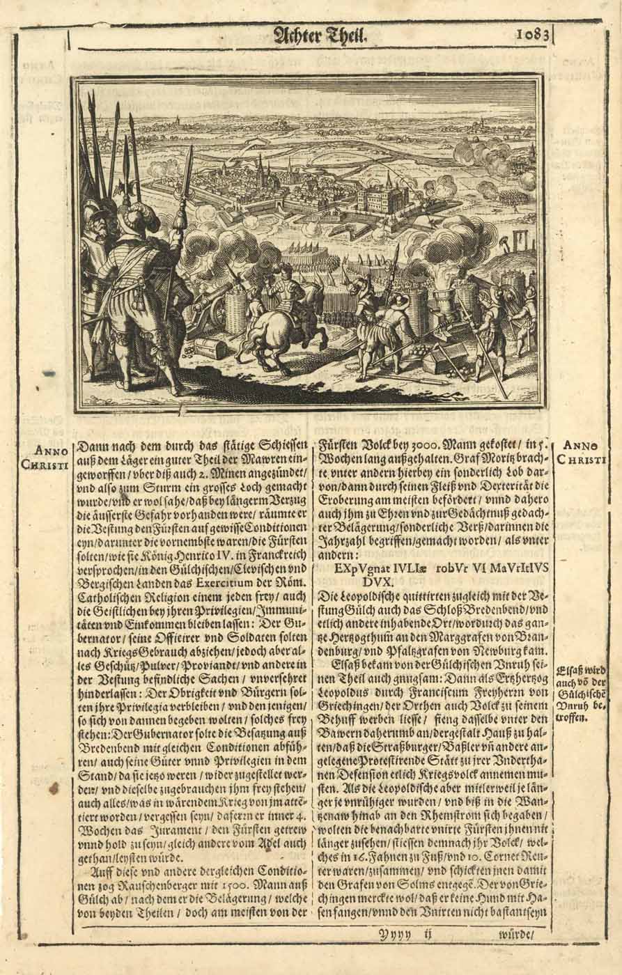 Neumann, Stadt u. Festung Jülich auf bildlichen Darstellungen 55. – 1. Zustand. – Zeigt die Belagerung der Festung Jülich 1610. – Das Schloß ist dargestellt als betürmte Vierfügelanlage mit Terassendächern. – Ganze Buchseite.