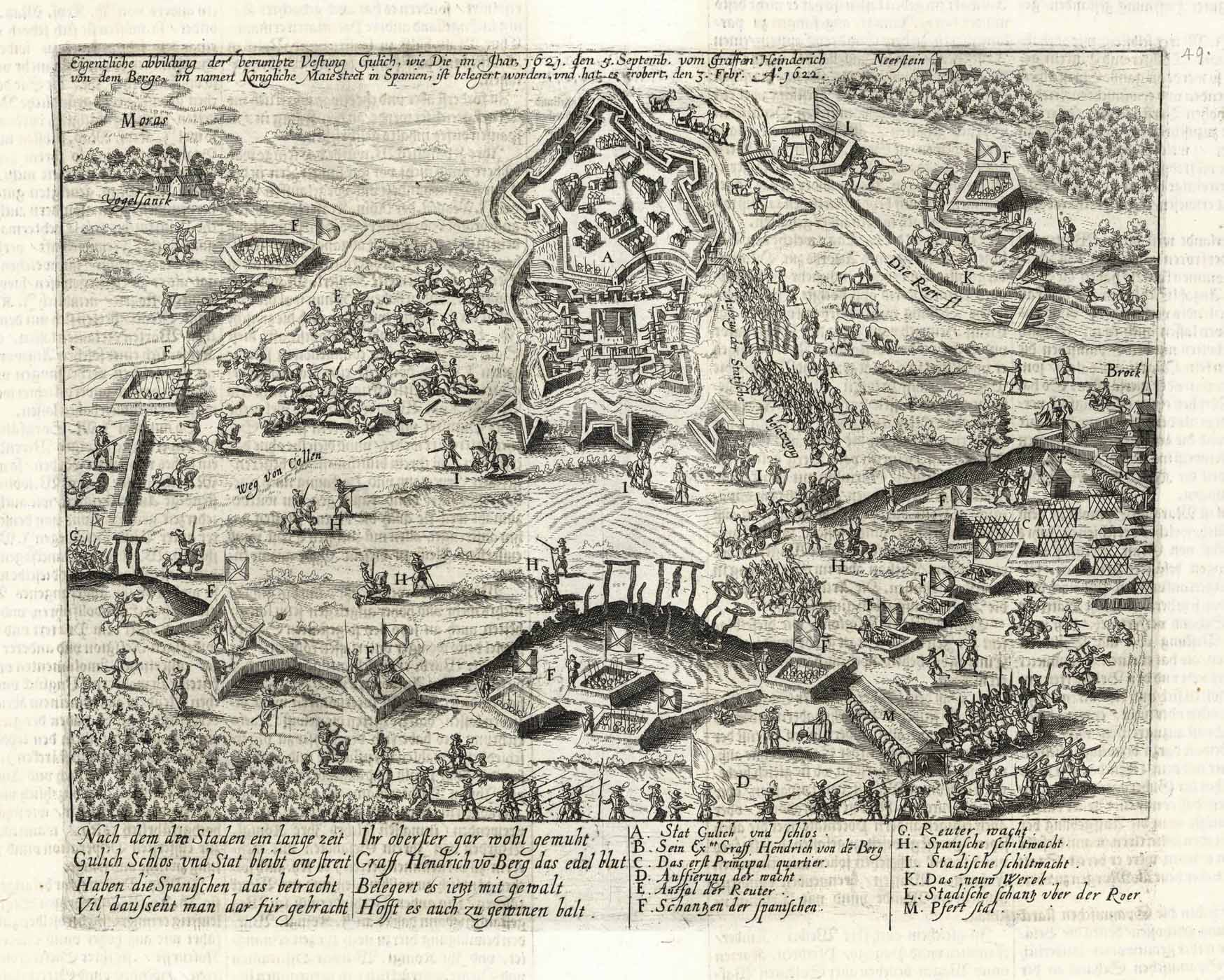 Gesamtansicht aus der Vogelschau mit Belagerung im Jahre 1622 (‘Eigentliche abbildung der berumbte Vestung Gulich, wie Die im Jhar, 1621. den 5. Septemb. vom Graffen Heinderich von dem Berge im namen Konigliche Maiesteet in Spanien, ist belegert worden, und hat es erobert, den 3. Febr. A° 1622.), Kupferstich v. Abraham Hogenberg aus Fama Austriaca b. Enß, 1627, 19,5 x 27,5 cm